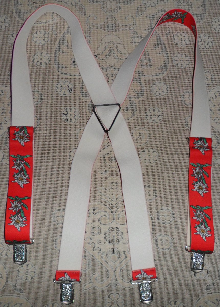 Підтяжки X-подібні широкі на кліпсах, колір червоний з едельвейсами, стан як новий (не ношені), повна вільна довжина 102 см (тягнеться до 112 cм), ширина 35 мм. Ціна Продано! Відправка зручною для Вас службою доставки по передоплаті на картку Приват. Доставку сплачує покупець.