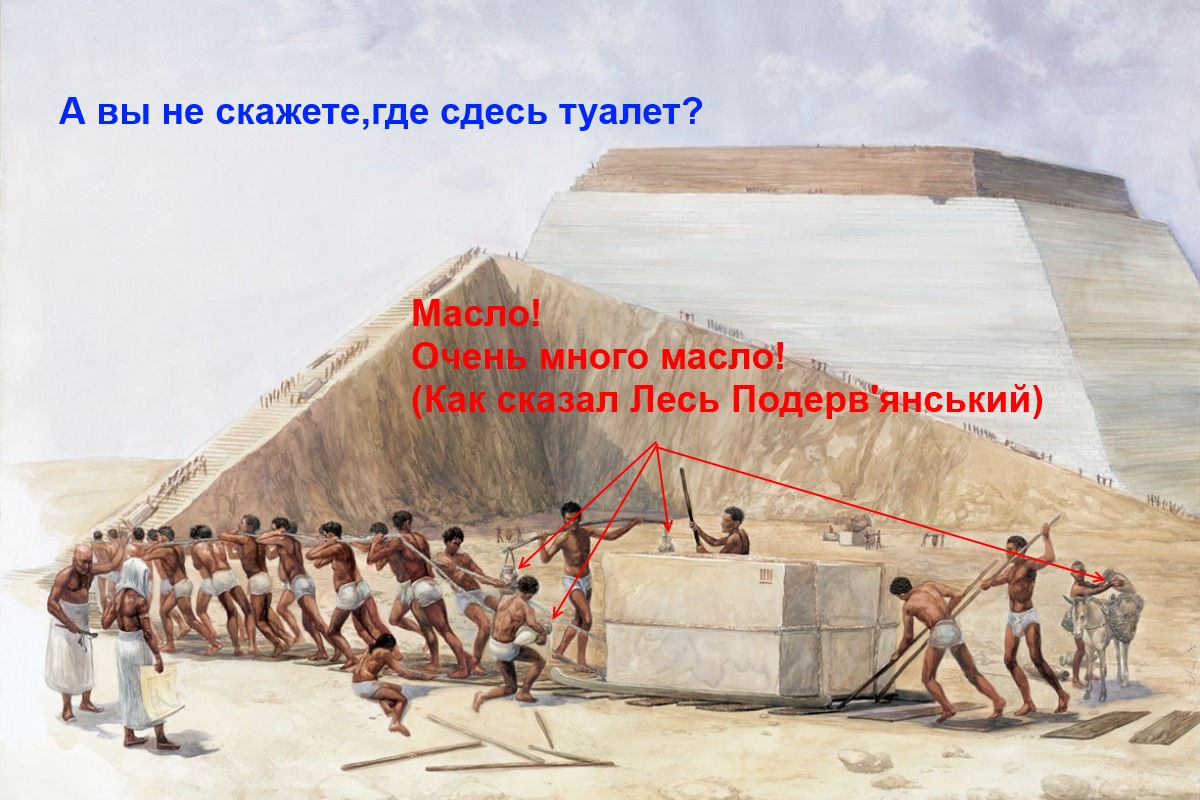 Египтологи умные пацаны! Когда им сказали"Вы идиоты хоть что то о трении слышали?Как то не очень легко тащить каменюку по песку. На что сразу получили ответ"А они маслом все поливали,так на много легче тянуть" На первый взгляд да,все замечательно! Но ! Легко тянуть только тем кто тянет первый камень,все остальные будут идти по облитой маслом замле! Масло будет литься рекой,его не возможно убрать с камней или засыпать песком. Уже через неделю все превратится в маслянную кашу. Но это неглавное!На такой жаре масло начнет портится! А это привлечет много мух! Их будет столько,что солнца не увидите! А вы там заметили туалеты? Ой не смешите меня! Процесс непрерывный,останавливаться нельзя! А значит сцать и срать будут под ноги! Через месяц там будет по колено говна ,мочи смешанные маслом! А это мероприятие 30 лет продолжалось!! А что там руки мыли? И что не будет эпидемии? Ну хотя бы банальной дезентерии,не говорю уже о желтухе триппере и прочей инфекции. Блин! да от элементарного ОРВИ половина строителей сдохнет! А вы говорите космос,технологии. А срать то где??????????????????????????????
