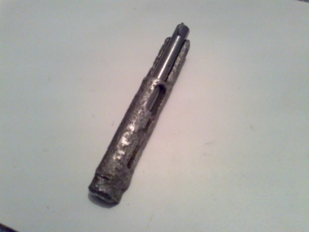 Проточил ствол. Перед тем как проточить, нагрел ствол и дал естественно остыть. В процессе сварочных работ иногда получаются круглые пятна от сварки, чтоб их не било я делаю залепухи. После них не заметно что металл варился а появляется эмитация чуть раковинок (а иногда и не получается, просто ровненький ствол). Один из минусов в том, что после залепух металл в этих точках как калёный, напильник плохо берёт. Обточить ровно очень тяжело, для этого и грею, потом всё как по маслу идёт. По залепухам опишу позже. В ствол вставил пластиковый дюбель, завинтил шуруп, срезал шляпку и зажал в дрель. Проточил. Получилось не плохо.