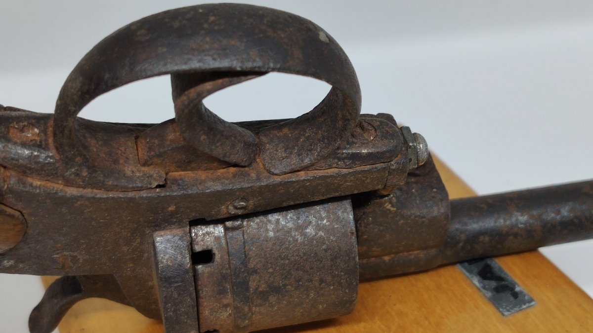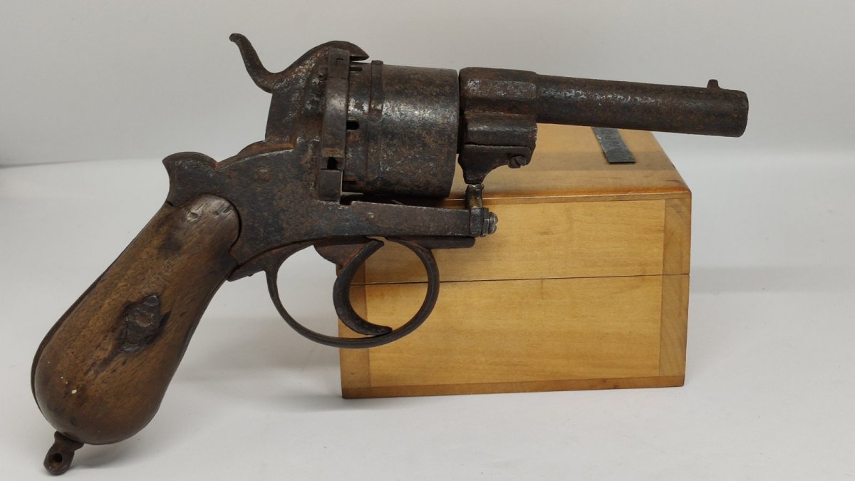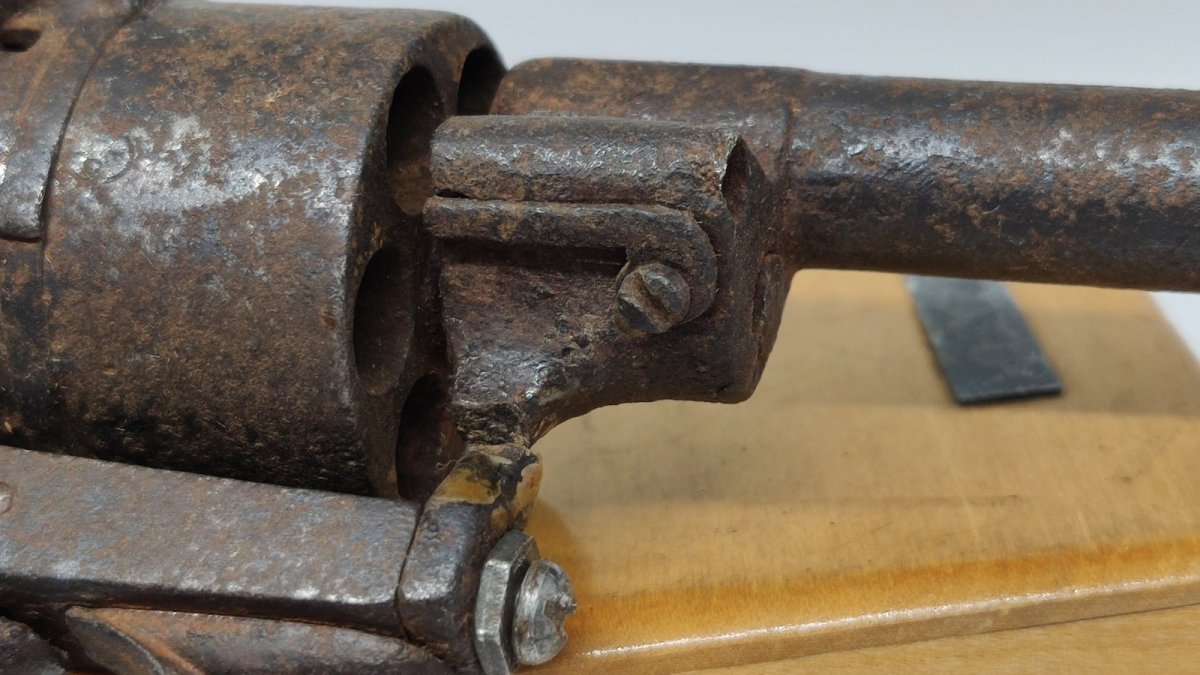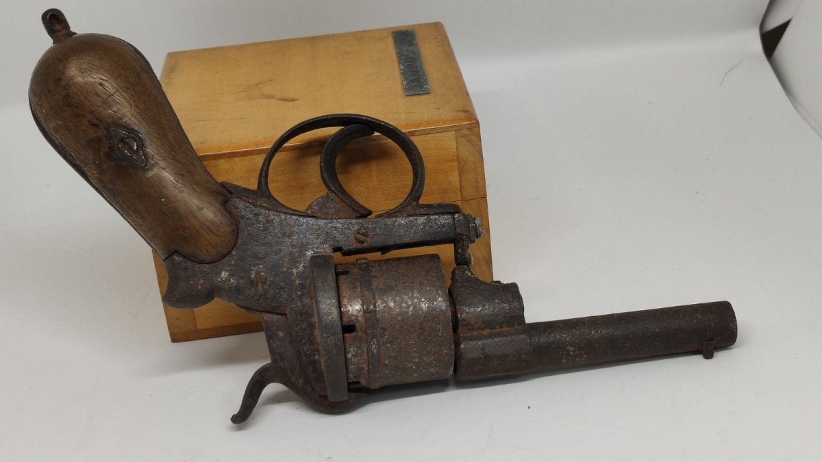 Добрый вечер. Кажется что-то от лефоше, патроны под шпилечный капсюль, поэтому сверху и бьет. Камрады подтянутся точнее скажут. С ув.