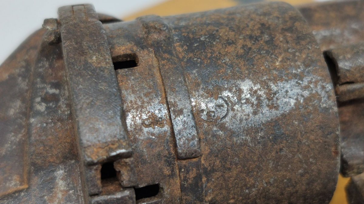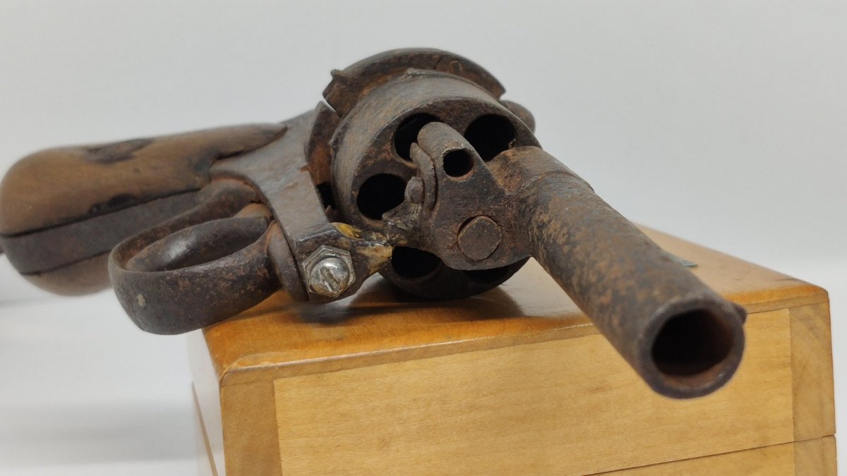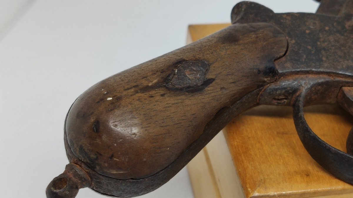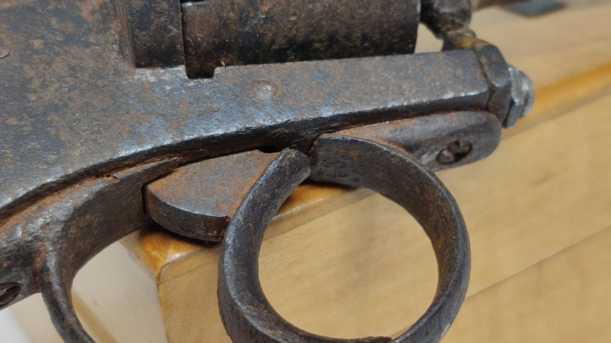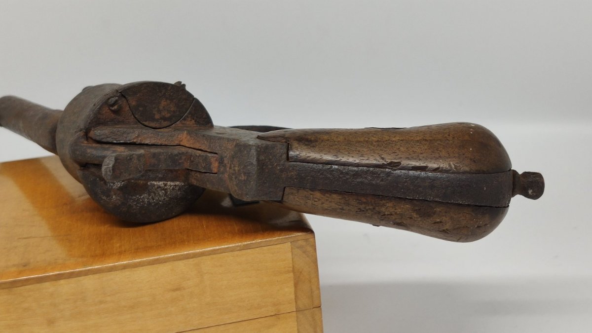 Добрый вечер. Кажется что-то от лефоше, патроны под шпилечный капсюль, поэтому сверху и бьет. Камрады подтянутся точнее скажут. С ув.