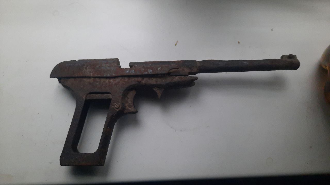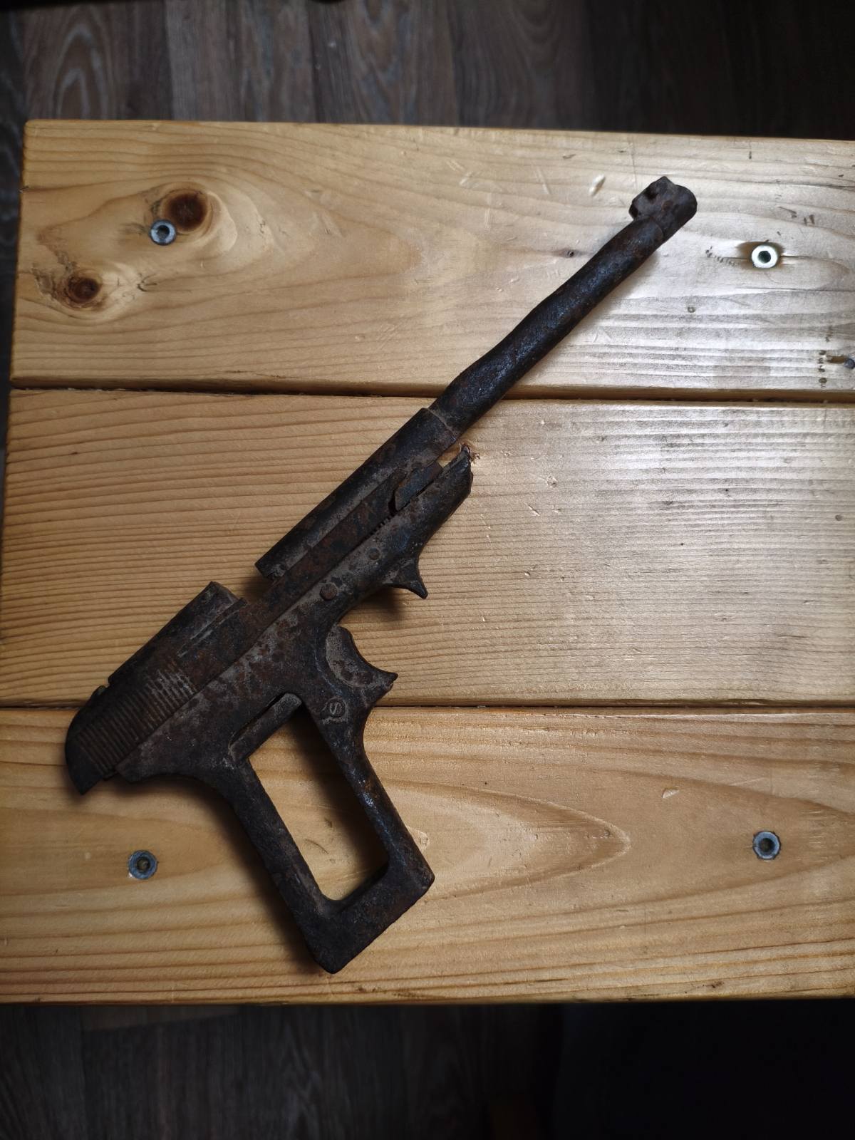 Здравствуйте, рамка и задняя часть затвора подозрительно похожи на ТТ, ствол явно самодельный по типу Вальтер П38.