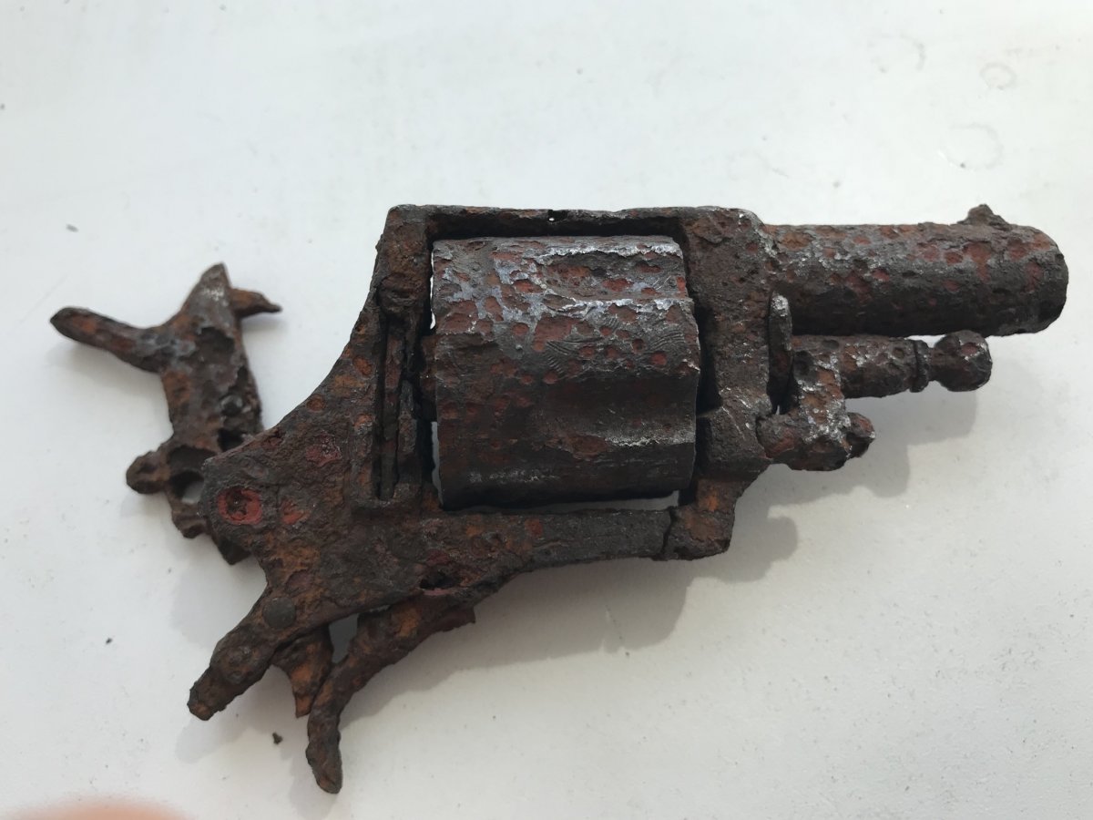 Добрый вечер панове) Подскажите по остаткам пистолета ? Почитал, вроде «бульдог», но аналогичной модели не нашёл. Был найден на дне блиндажа. С уважением.