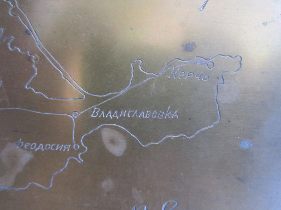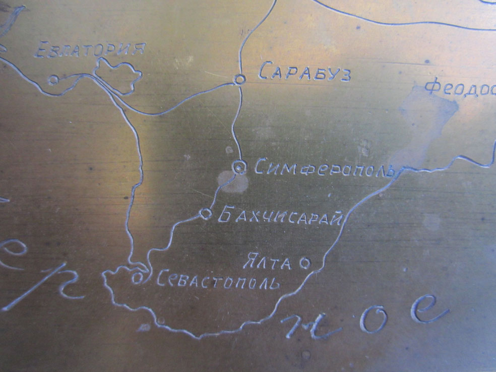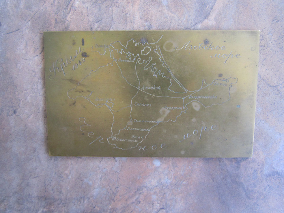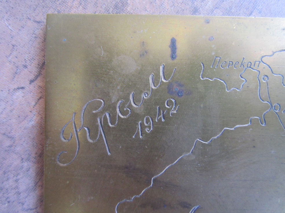 Латунная плакетка с изображением полуострова Крым, нанесена дата - 1942 год. Размер 97 х 161 мм, толщина пластины 3 мм. Изображение нанесено штихелем. Вещь принадлежала немцу и была прихвачена в виде трофея. Яркая и антуражная вещь в коллекцию по теме Крыма! Цена: 480 грн.