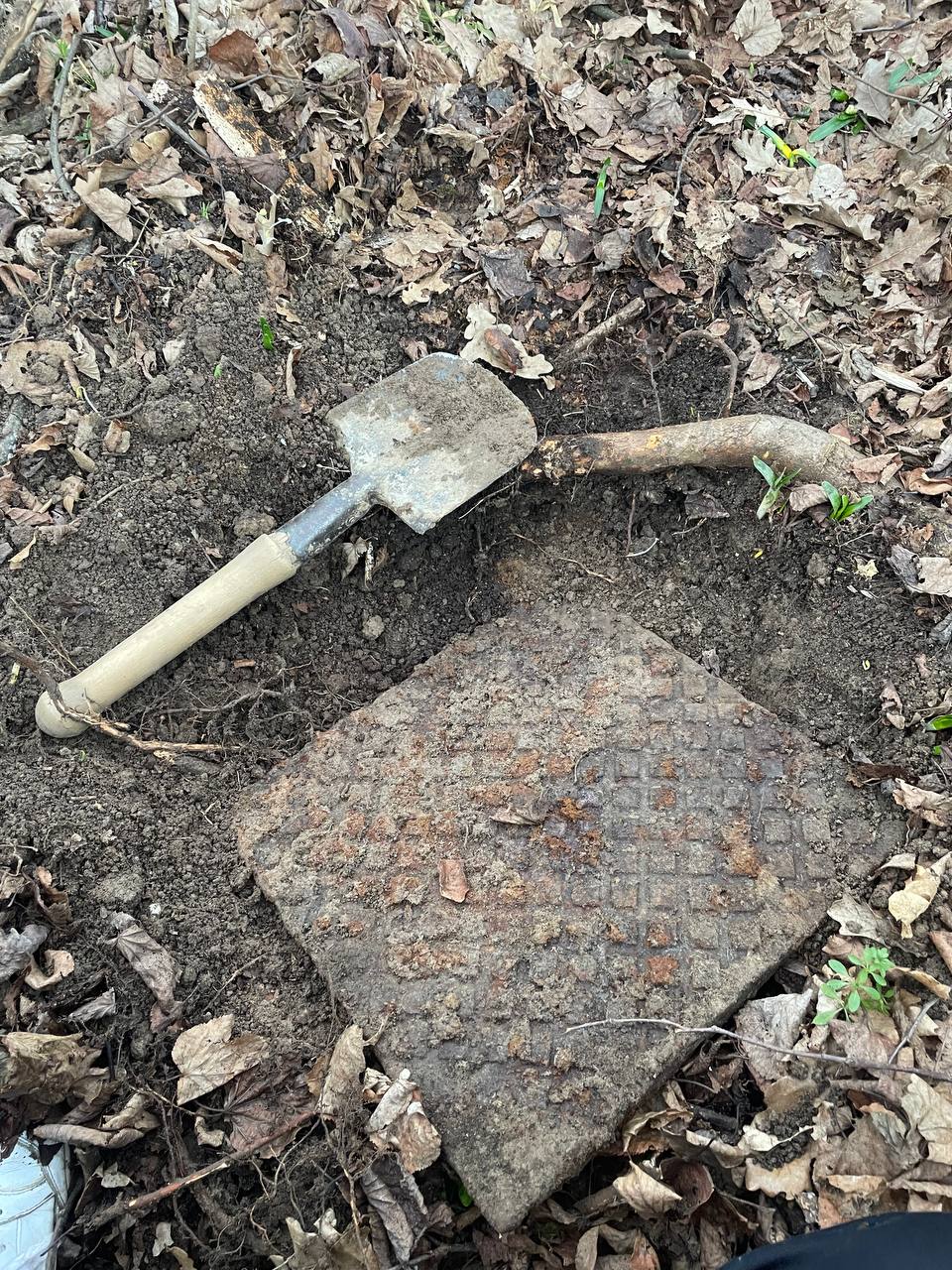 1. Гуляючи лісом з позиціями першої світової знайшов приладом цікаву плиту : товщина десь 1,5 см якщо дивитись по ребрам жорсткості , дуууже важка , квадратної форми , для наглядності поставив саперку збоку бо не мав з собою більше нічого
