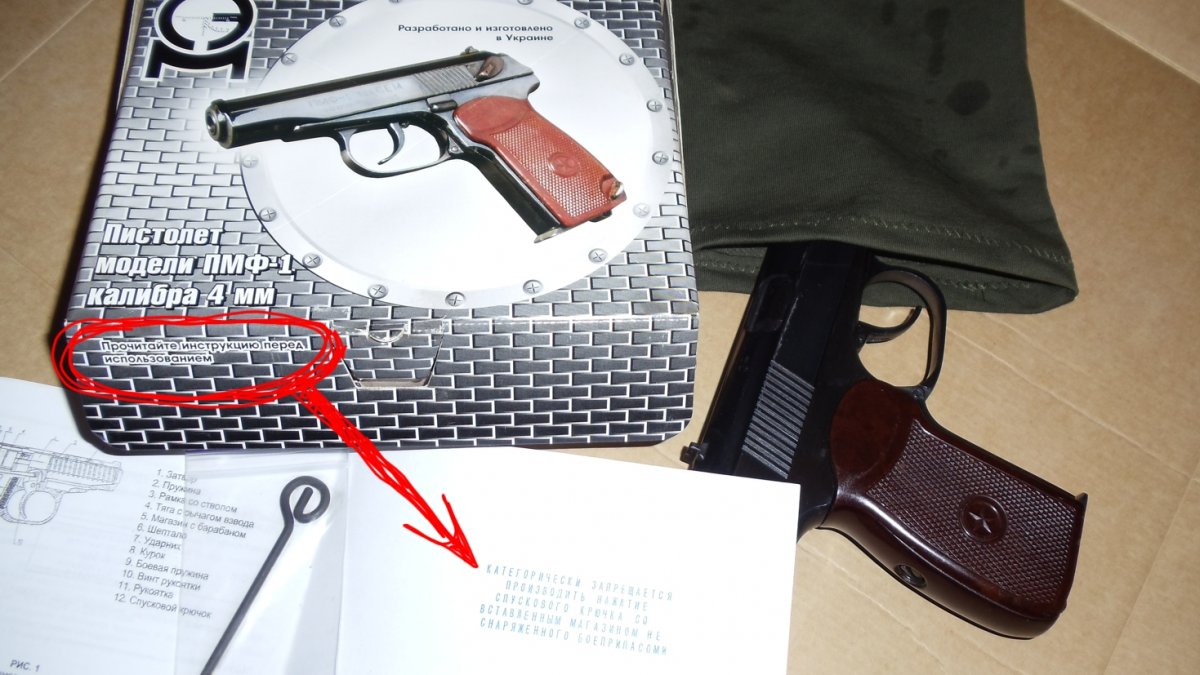 - Сам тюнингованый ПМФ, родная коробка, мешочек под девайс, мануал, приблуда для извлечения стреляных гильз.
