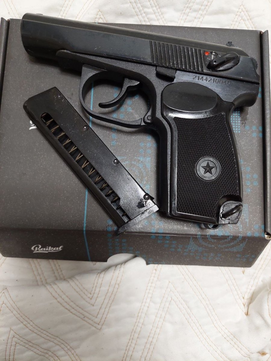 Рукоять, предохранитель, ЗЗ (затворная задержка),спусковой крючок, курок и пачка расходников .