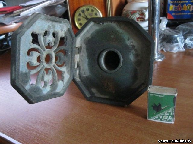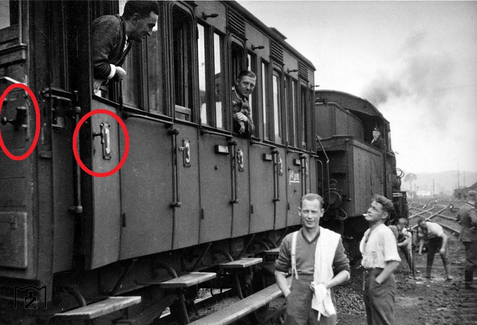 Стоп кран (надпись - NOT-BREMSE): Обломки чугунных подпоров полок: На внутренней стороне одной двери сохранились плитки с надписью: Дверь не открывать пока поезд не остановился Тут деталь от "чугунки" вагона: Надпись глосит Keizung. Рукоятка от дверей тамбура: Механизм дверной рукоятки: