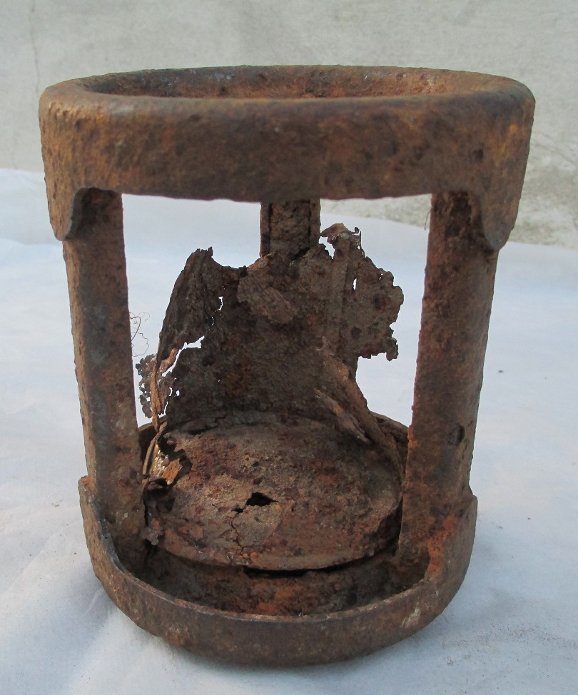 Доброго часу На ідентифікацію такий предмет, видніється слід жовтої краски. Є клеймо яке ледь читається. В середині залишки консервної банки.
