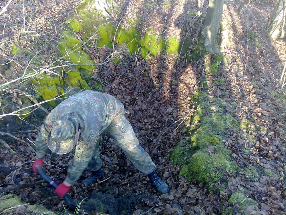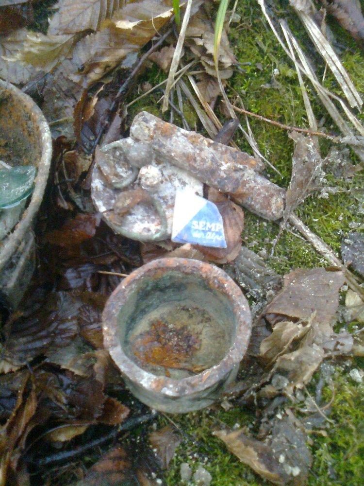 Сьогодні попробували розкопати блін. Результат не втішний. Із знахідок - попільничка із гільзи, складний стальний ножик, каблук, дистанційка від 75-ки,уламок дзеркальця,2латунних кільця, 2 битих пляшки і консерва