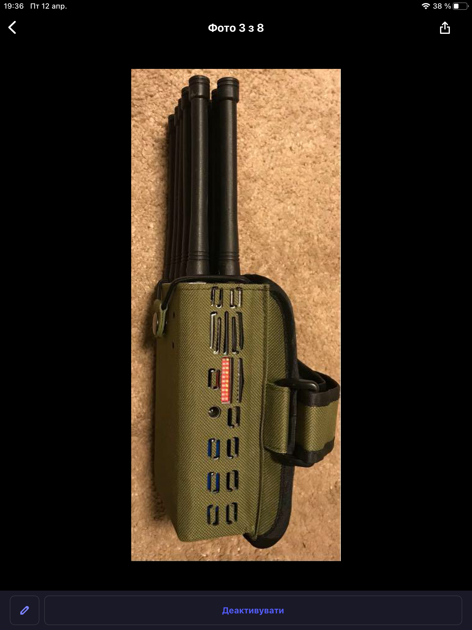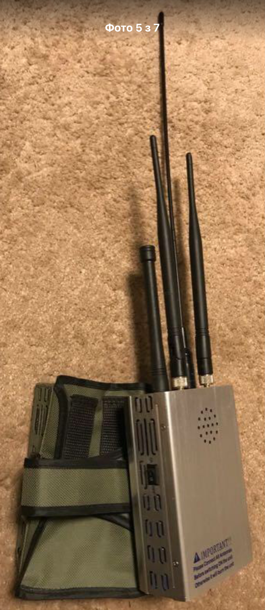 Лот №1 Подавлювач дронів придушення Anti-drone з десятьма частотами по 5 ватів кожна та пронумерованими антенами під кожну частоту. Тумблер вимкнення кожної частоти. Два кулери охолодження, батарея 12 вольт вистачає на дві години безперервної роботи. Зручний чохол для перенесення на руці. Корпус виготовлений з алюмінію радіаторної форми для покращеного охолодження. Даний генератор є індивідуальним мобільним засобом захисту придушення від дронів і таке інше!! Частоти розподілені на пронумерованих антенах у такому порядку Frequency Bands CT-1010 Europe Type: 1 - LOJACK 157-184 MHz; 2 - GPS L2; 3 - DCS, GSM 1800-1920 MHz; 4 - 3G 2100-2170 MHz; 5 - 4G H 2570-2690 MHz; 6 - GPS L1 + Glonass L1; 7 - 2G 913-970 MHz; 8 - WiFi/Bluetooth 2400-2500MHz; 9 - WiFi5, 5GHz; 10 - 790-830MHz 4G LTE Low; Ціна: 38000 грн. Лот №2 Опіративний та мобільний подавлювач дронів Anti-drone з трьома частотами 315 MHz і 433 MHz по 5 ватт кожна, і остання 868 MHz з двома антенами по 10 ват. Ефективно глушить сигнал на дистанції до 150 метрів прямий видимості. Батарея на 24 вольти і приблизно вистачає на дві години безперервної роботи. Система охолодження із двох радіаторів. Зручний чохол для перенесення на руці. Незамінний індивідуальний засіб для зупинки та захисту від дронів тощо!! Антени пронумеровані та мають такі частоти придушення: 1 - 315 MHz 5W; 2 - 433-435 MHz 5W; 3 - 850-940 MHz 10W; 4 - 850-940 MHz 10 W; Ціна 36000 грн.