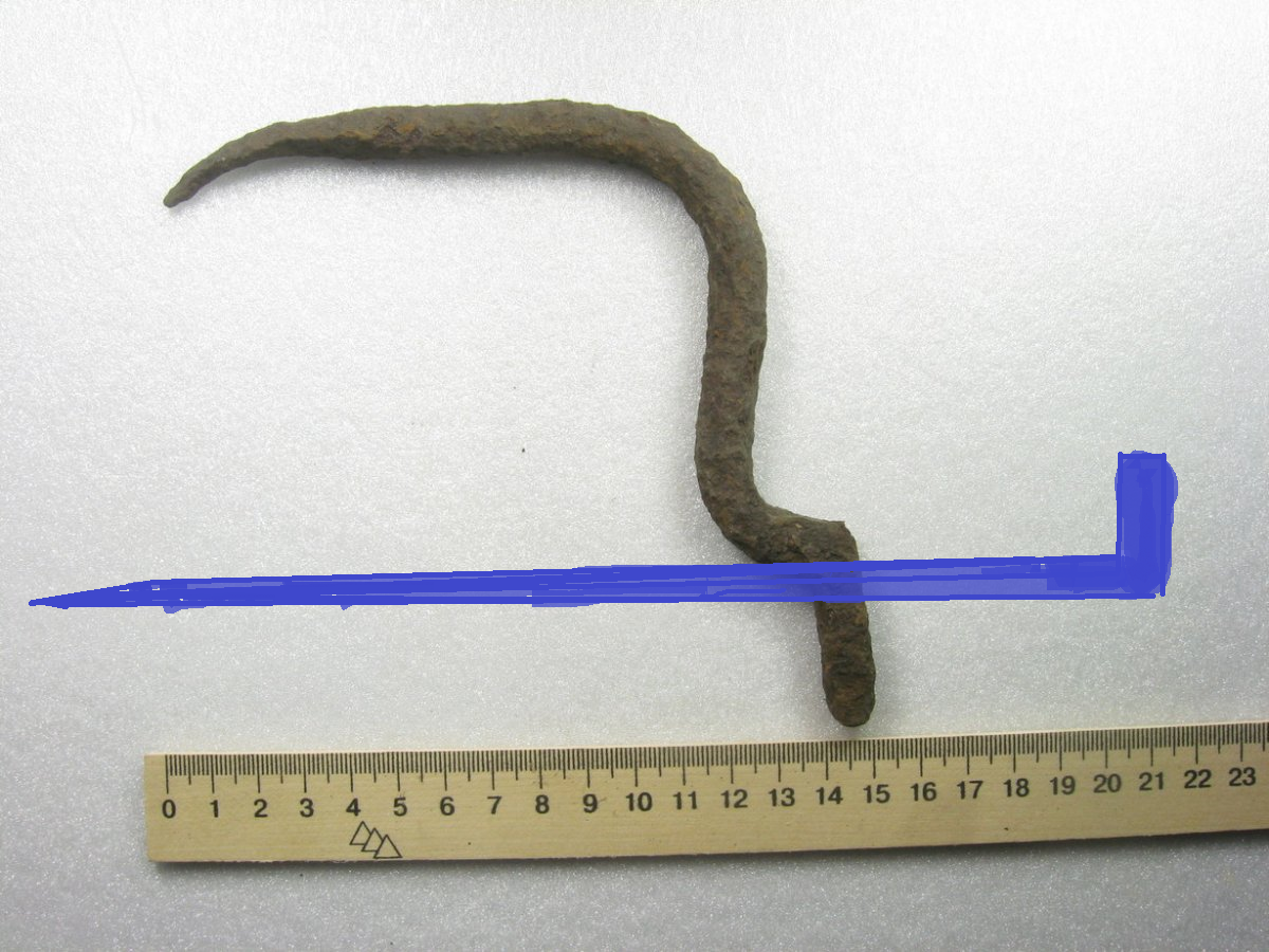 З приводу полоси з прямокутними отворами.Питав я батька (траплялися різної довжини і на деяких ще й потовщення було як руківья і з одного краю як заточка)сказав що то такі ножі були очерет різати.