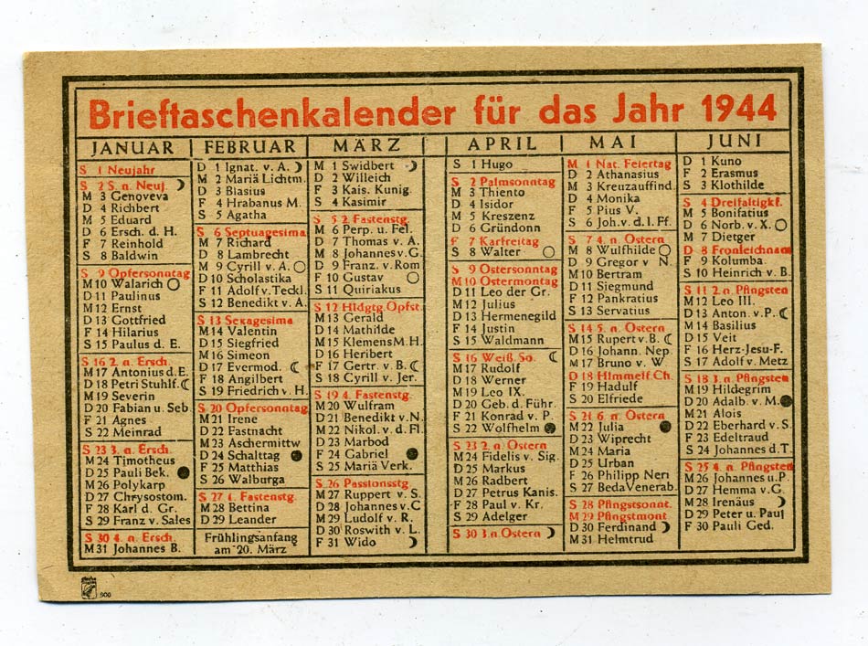 Ответ: Подскажите по цене 1. На календаре - по католическому сборнику-именины на каждый день...То есть 26 например января-день Поликарпа. 2. На обложке надпись-"Записная книжечка с календарем". так называемый Термин-календарь, туда записываются на неделю все твои встречи и посещения. Еженедельник-короче. Без него в Германии ни шагу. Все по терминам. От похода в гости- до 5-мин. разговора с банковским клерком. Постучать в кабинет-и спросить"Разрешите?" - немыслимо.... А термин -время встречи, можешь получить и через полтора месяца.... 3. Марка " Железные дороги Рейха". Служебная.