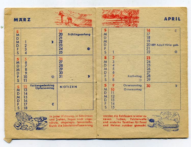 Ответ: Подскажите по цене Спасибо за ответы. Правда календарик мелковат, что бы туда на каждый день все расписать... Кстати, в записной книжке еще указаны, видимо, праздники. День рождения Гитлера, например. А что написано под календарем на развороте? Сколько может стоить такая марка? В каталогах ее нет, а филателисты как всегда пишут всякий бред... Если кому-нибудь нужны эти вещи - они продаются.