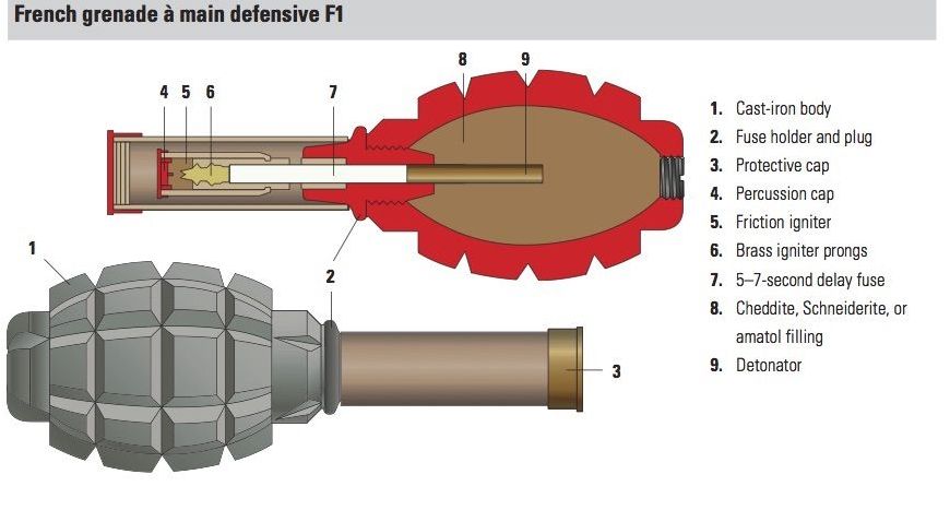 Так, немного информации. Может, кто не видел. На мой взгляд, интересной. Grenades à fusil expérimentales F1 sur baguette avec allumeur type Feuillette Оригинальное описание на французском языке. " Il s'agit d'une grenade F1 qui reçoit à sa base une baguette d'une longueur de 30 cm pour un diamètre lègérement inférieur à 8 mm. L'allumeur est un classique allumeur modèle 1916 à percussion. Le système de mise à feu est constitué par un tube d'une longueur d'environ 9 cm qui coiffe l'allumeur modèle 1916 comme un capuchon de protection. Au sommet de ce tube, une maselotte en plomb est maintenue en place par un fil de cuivre et traversée par une goupille de sécurité. La grenade était placée dans le fût du canon, la goupille retirée avant le tir. Au départ du tir, le recul cassait le fil de cuivre et la maselotte venait percuter l'allumeur. "
