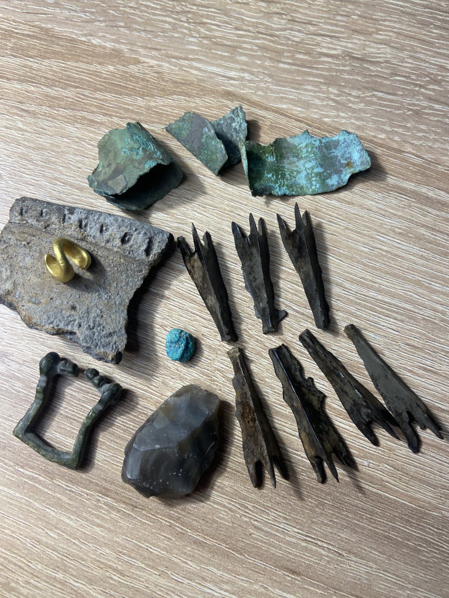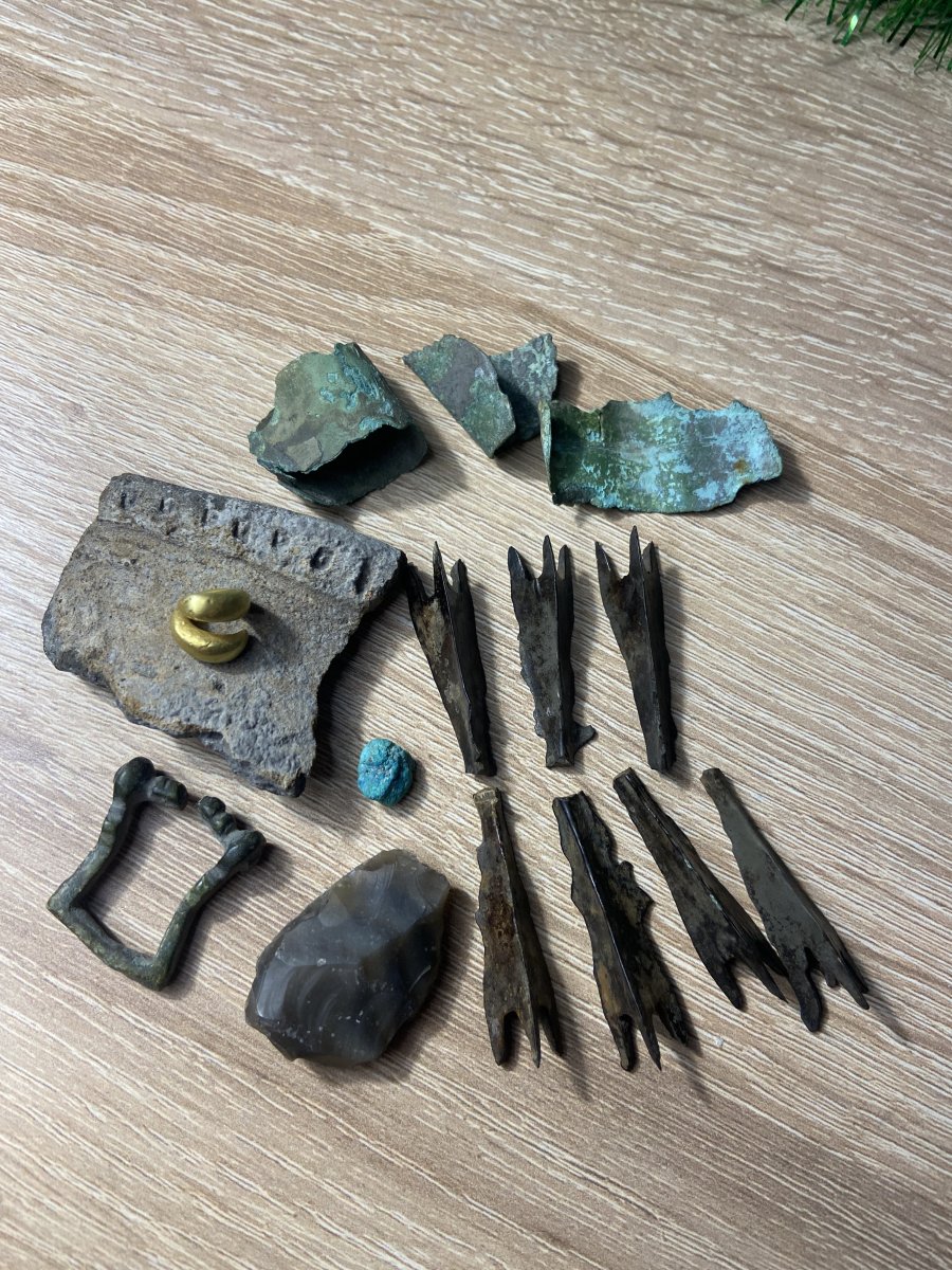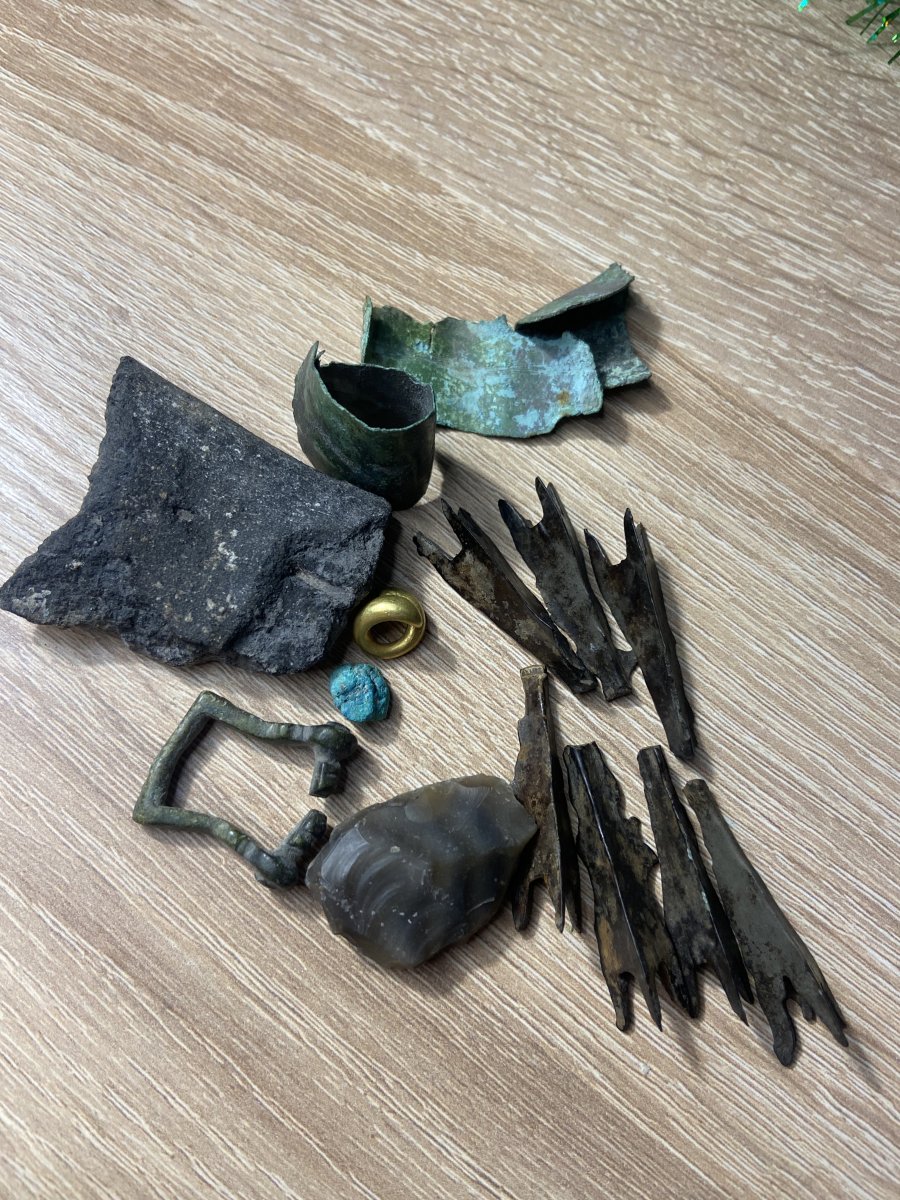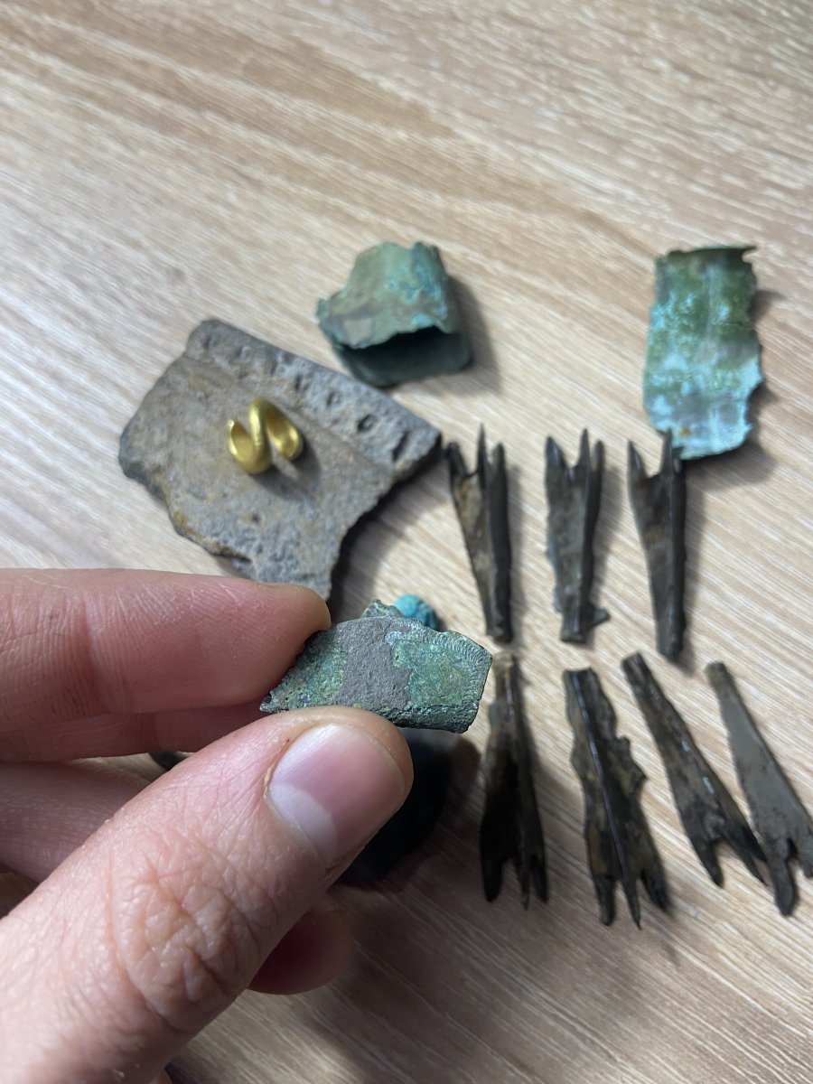 Здравствуйте. Все находки с одного поля. Регион находок - Киевская область, интересует период, Скифы ? Или раньше ??? На тоненьких кусочках бронзы, виднеется орнамет.