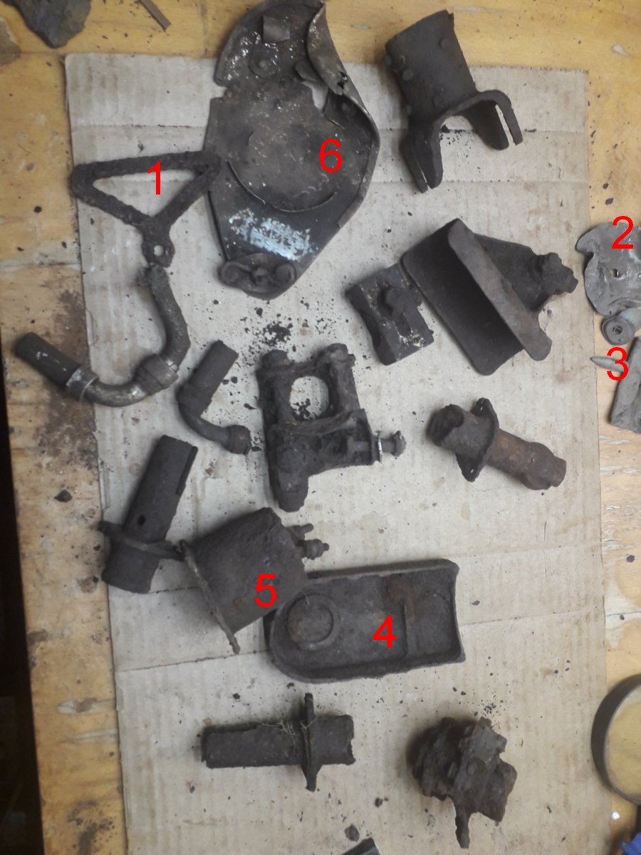 Поздравляю у вас сбитый советский самолет. 1. Пряжка замка пристяжной системы кресла пилота. 2. Вроде шкала прибора наддува. 3. Над тройкой пряжечка от чехла парашута. 4. Крышка авиапулемета ШКАС. 5. Похоже корпус авиприбора. 6. Лючек на них иногда набивался заводской номер самолета.