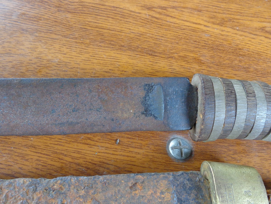 Снять латунь просто-отрезать болгаркой кусок хвостовика и снять.Учитывая состояние клина,он уже ничего не стоит.По второму клину-вполне возможен точеный-переточеный обрубок шашки и дореволюционного образца(по фото клейм вобще не понять),но это ему уже никак не поможет-к сожалению уже мусор ,одним словом