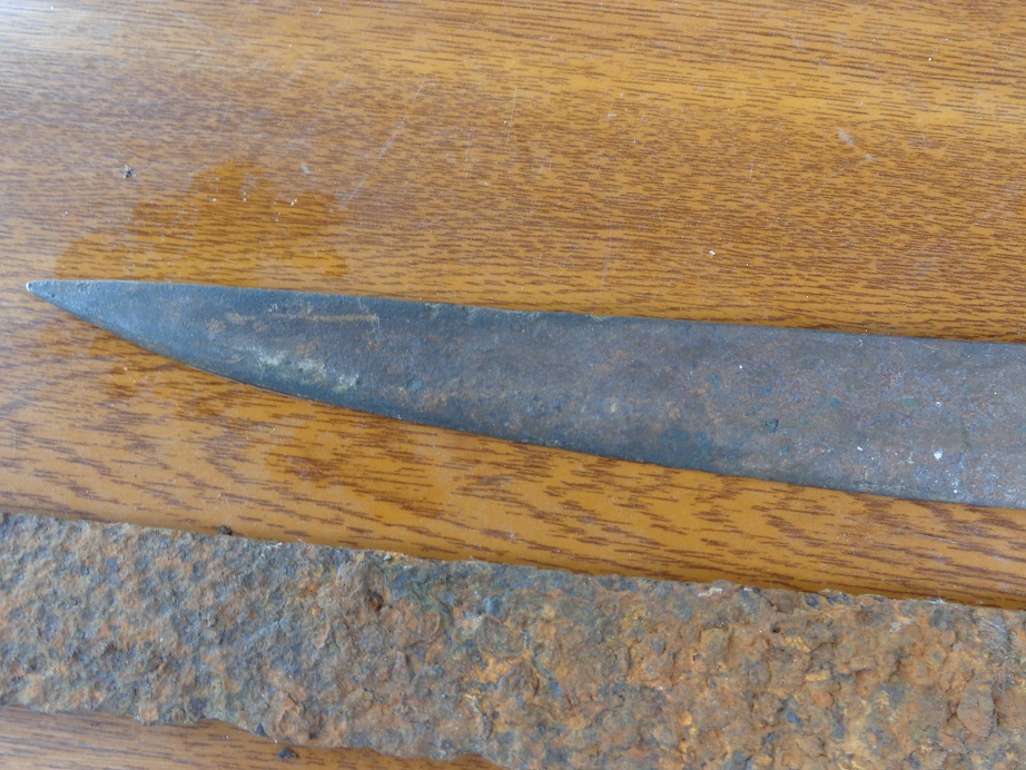 Приветствую. Копнул весной остатки М27. https://reibert.info/threads/shashka.608865/ Более менее осталась только латунь. Вопрос №1 как снят копитце , может есть какие способы дабы не добить латунь? Далие , подогнал мне дружок еще одну сабельку найденную лет надцет назад. По его рассказам рукоять была с серпом и молотом, но латунь где то потерялась и сделали самопальную рукоять. Но сравни их они оказались разными, Длинна клинка вроде понятно отломано заточено, а вот длинна хвостовика немного напрягла ... Также присмотрелся на коротком клинке просматривается клеймо ,буква толи А ,толи Д и может мне кажется но остатки двух главого орла? Собственно вопрос станет ли латунь с копаной шашки на этот клин и что это вообще за клинок? Извиняюсь за много букв.