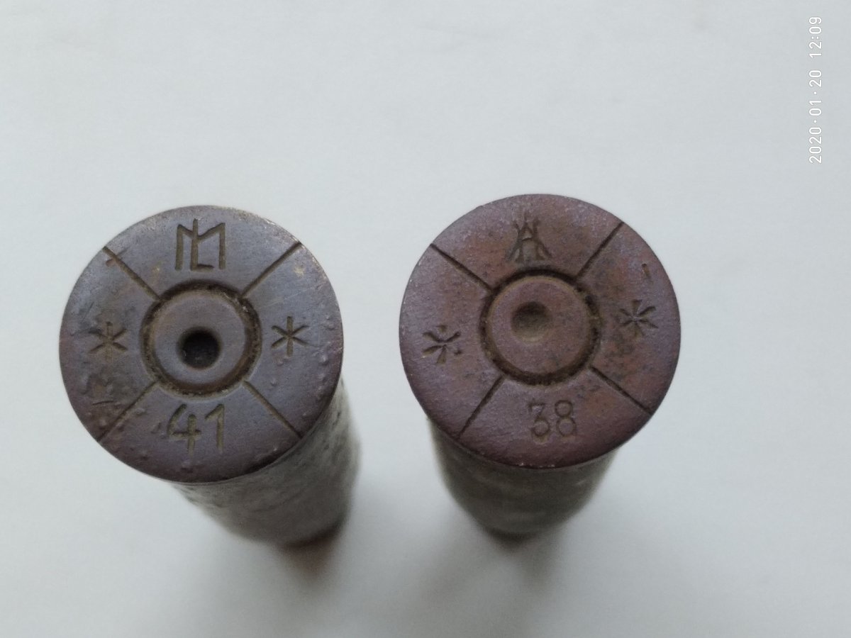 От тут і заковинка. Знайдені дані свідчать про те, що в 1931, коли почалися поставки австрійцями патрона 8х56, угорці власний патрон ще не виробляли. З початком власного виробництва патронів угорцями в 1932 і почали австрійці ставити одноцифрове клеймо року 2-3-4-5-6 (чув і про 7, але бачити не доводилось), на відміну від двоцифрових угорських. Таким чином виходить, що австрійцям належить і двоцифрове клеймо "31". До речі, воно доволі рідкісне в наших краях - мені так і не довелося знайти, але в моїй присутності його знайшла людина, яка присутня на нашому форумі.