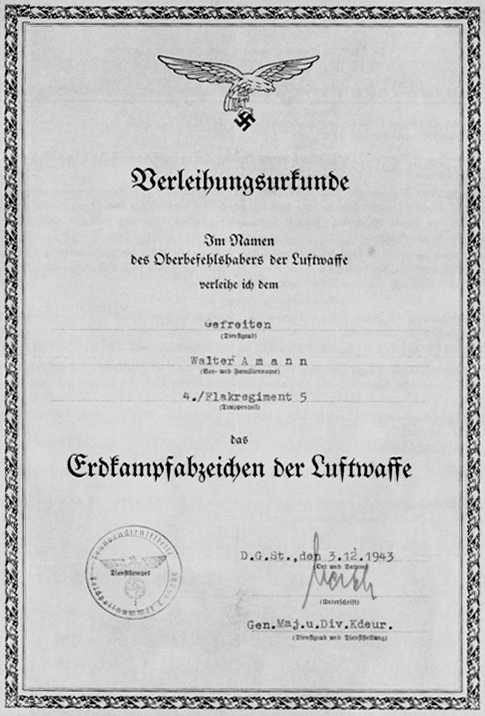 наградная грамота именем главнокомандующего люфтваффе награждаю старшего егеря франца кломера знаком "за наземный бой" дата, командующий генерал, подпись.