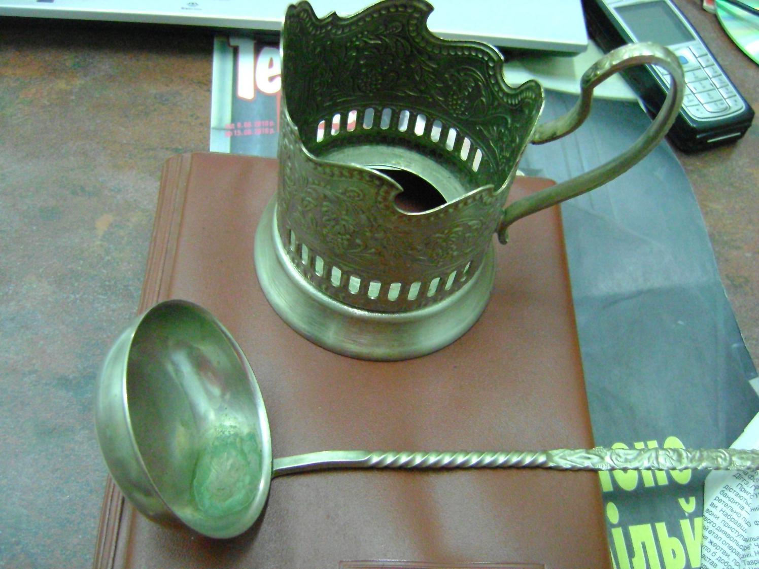 черпак похож на церковный.что за клеймо на нем?и металл.? по подстаканникам камрад сказал правду 50-70грн.но лучше обратитесь к спецам.http://podstakanniki.ru/