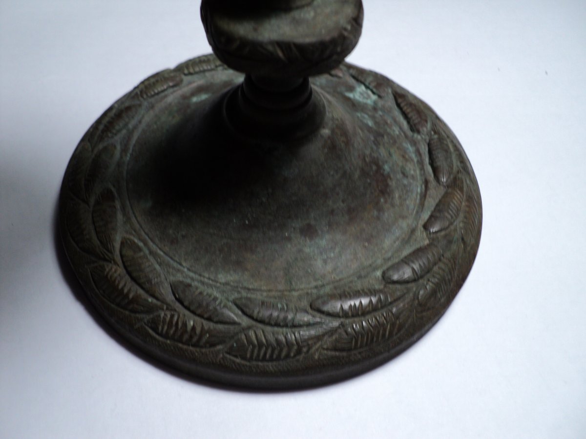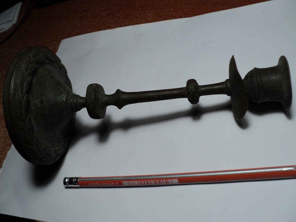 Нашел подобное на виолити https://auction.violity.com/99010068-starinnyj-bronzovyj-podsvechnik-vysota-19sm