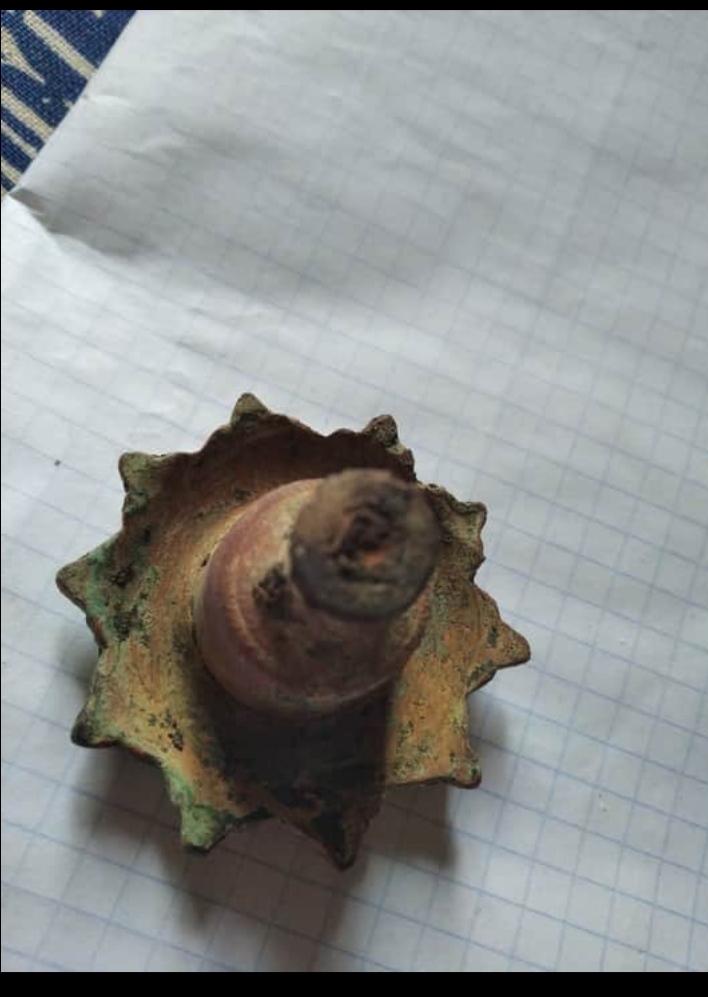 Сомневаюсь,что это чаша подсвечника.По фото непонятно,.есть ли вогнутость на чаше под воск.Шипы,опять же ,на чаше-зачем?Какой диаметр отверстия?И ось металлическая-имею много подсвечников,но не встречал подсвечников со стальной осью-везде резьбы латунь.