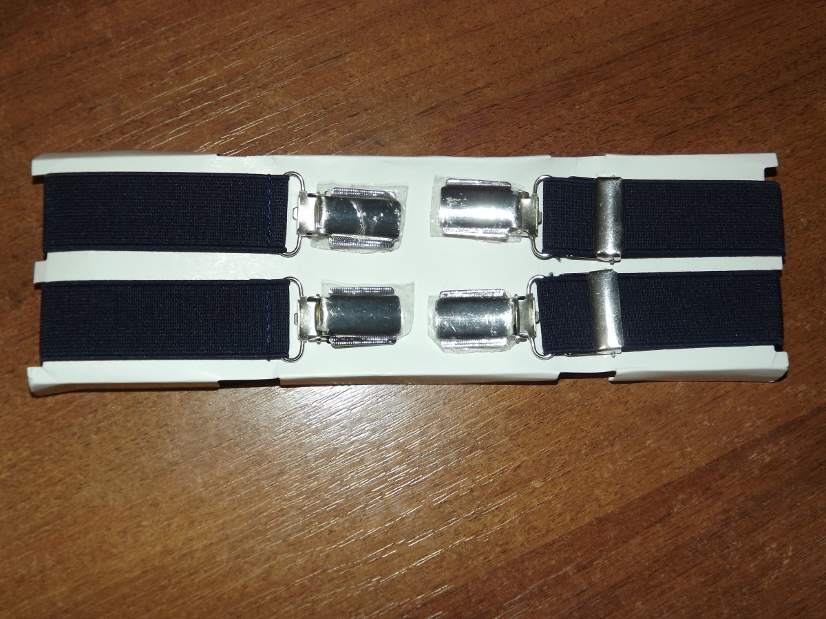 Лот № 28. Подтяжки на клипсах, новые ( немного помята упаковка), размер универсальный, ширина- 2. 5 см. Цвет темно синий. Цена 120 грн