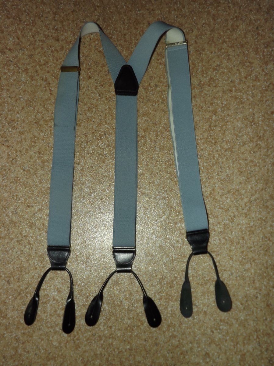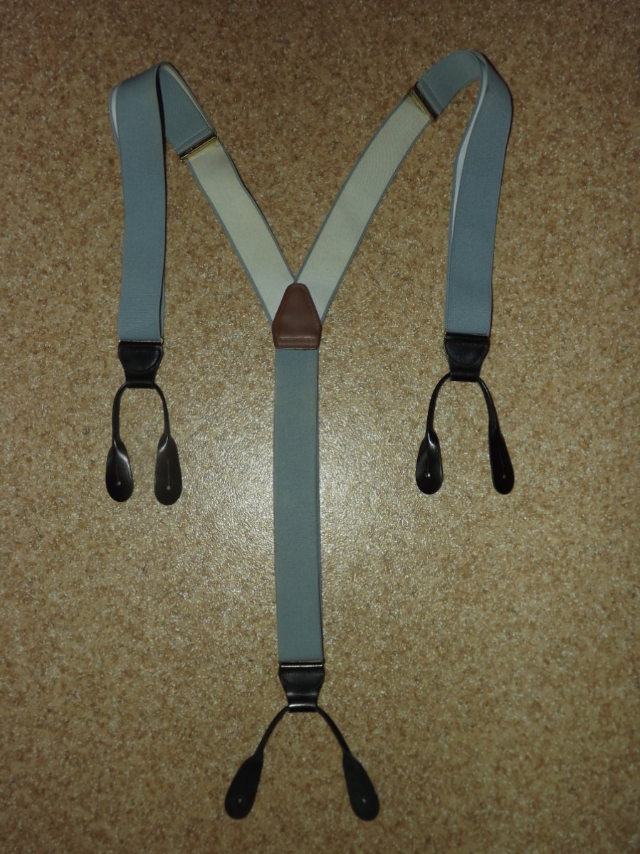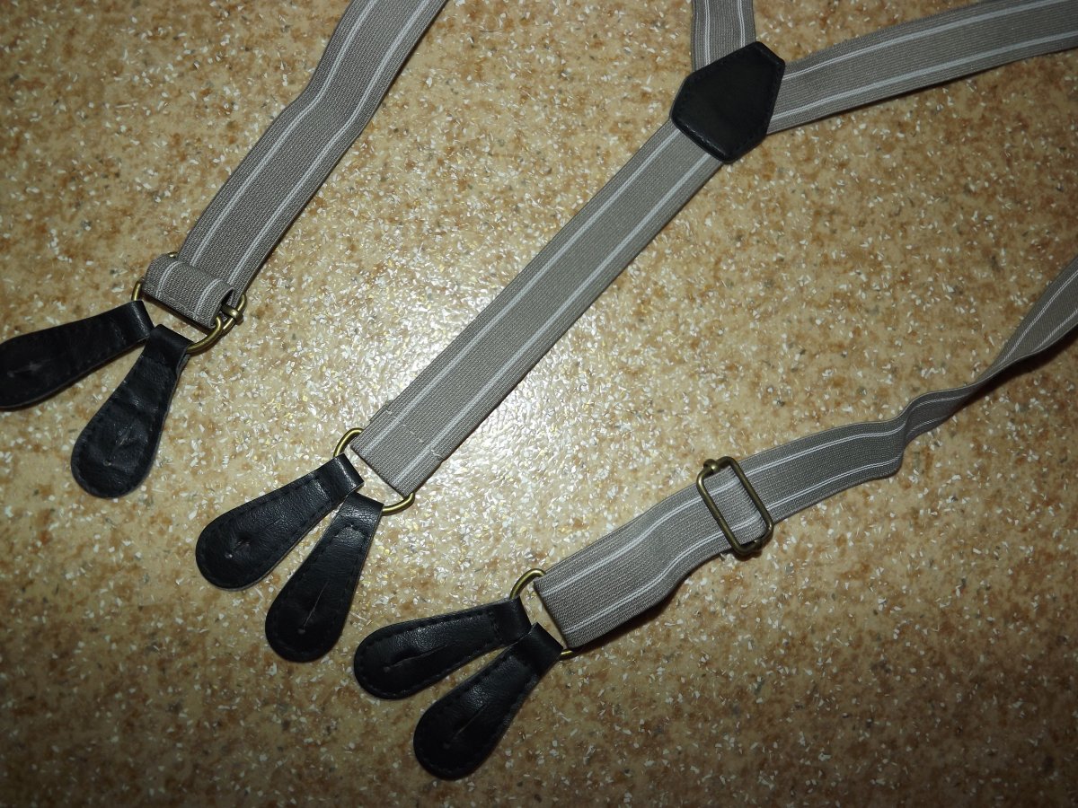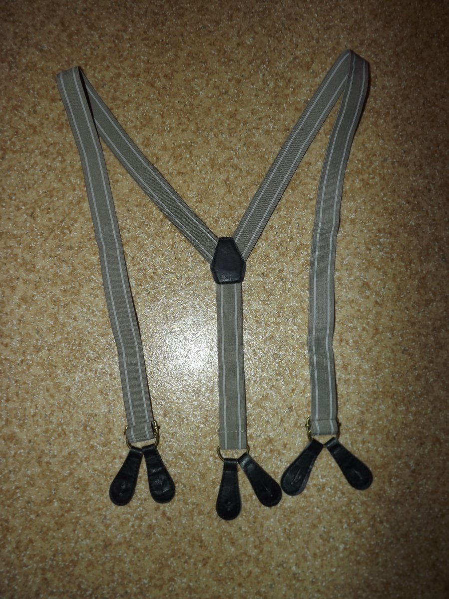 Лот №23. Подтяжки (для пуговиц), незначительное б/у, размер универсальный, максимально до 133 см ( не растянуты), ширина- 3.5 см. кожаные элементы. Цвет серый Цена- 70 грн проданы