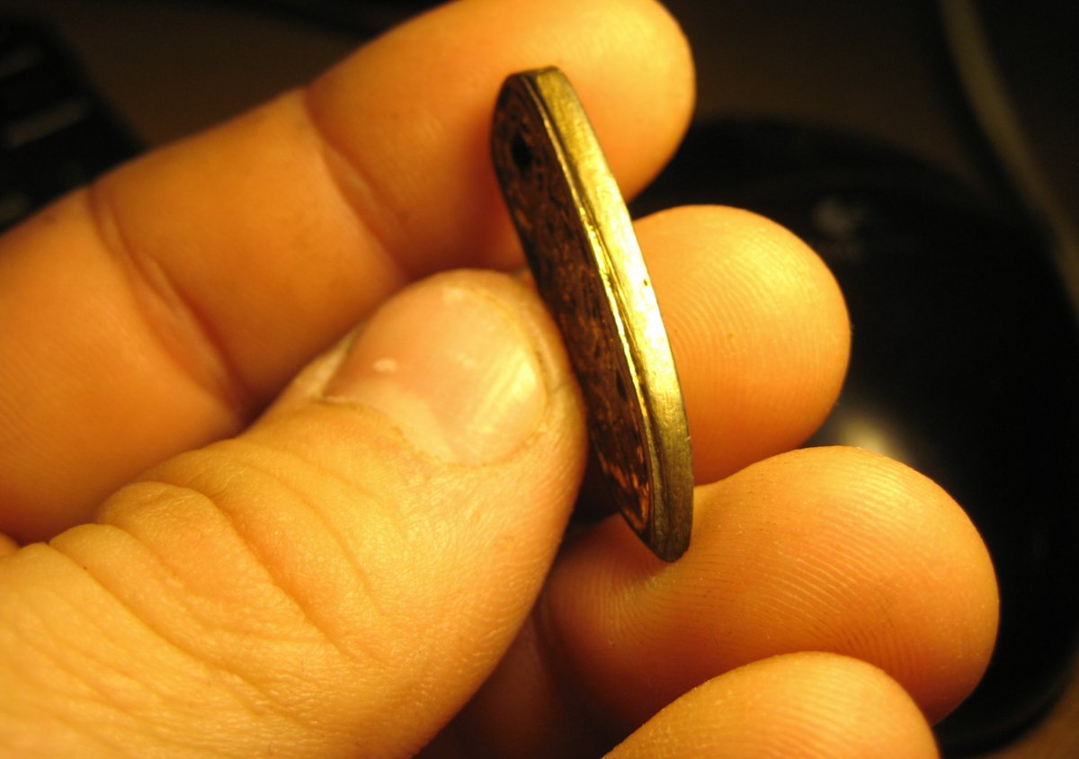 Помогите определить и дотировать предмет. Предположительно метал, серебро сверху позолота вес 5.29 гр. есть отверстие, в нем обломленное ушку, возможно часть какого то украшения типа ожерелье из таких кулонов или просто кулон оберег. Найдена в Одесской обл.