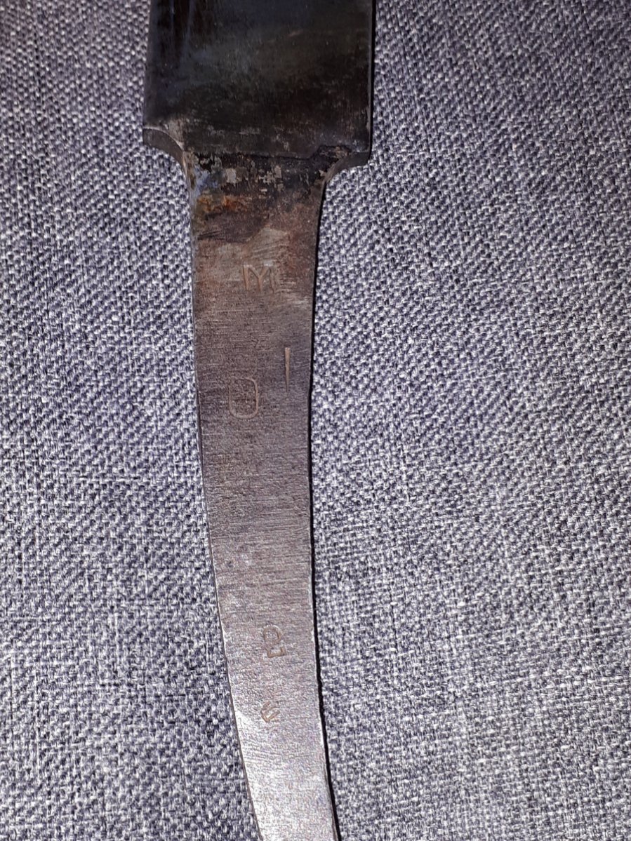 Клеймо М (военный инженер Мандич П.П. С 1939 года), ранняя. Жаль загубили. Возможно удаляли символику, Но тогда сняли бы накладную звезду, у меня такая же но ножна в подборе. с ув