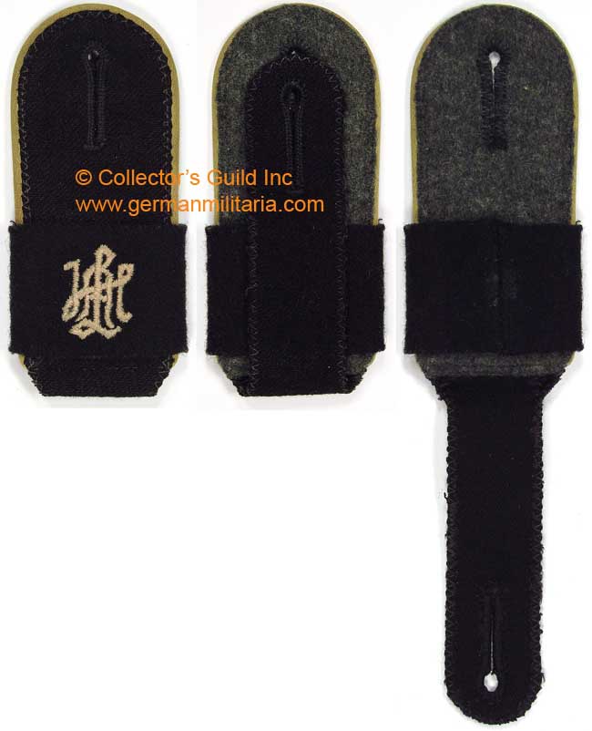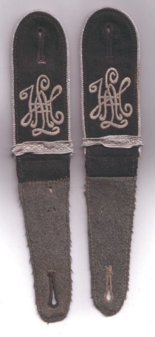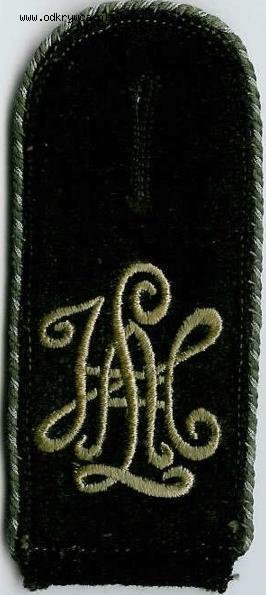 Ранние погоны Лейбштандарта. Овальный верх. Вензель фигурный, большой на всю ширину погона. Как правило шли в окантовке из черно-серебряного шнура, указывающие на принадлежность к охранному отряду LAH.