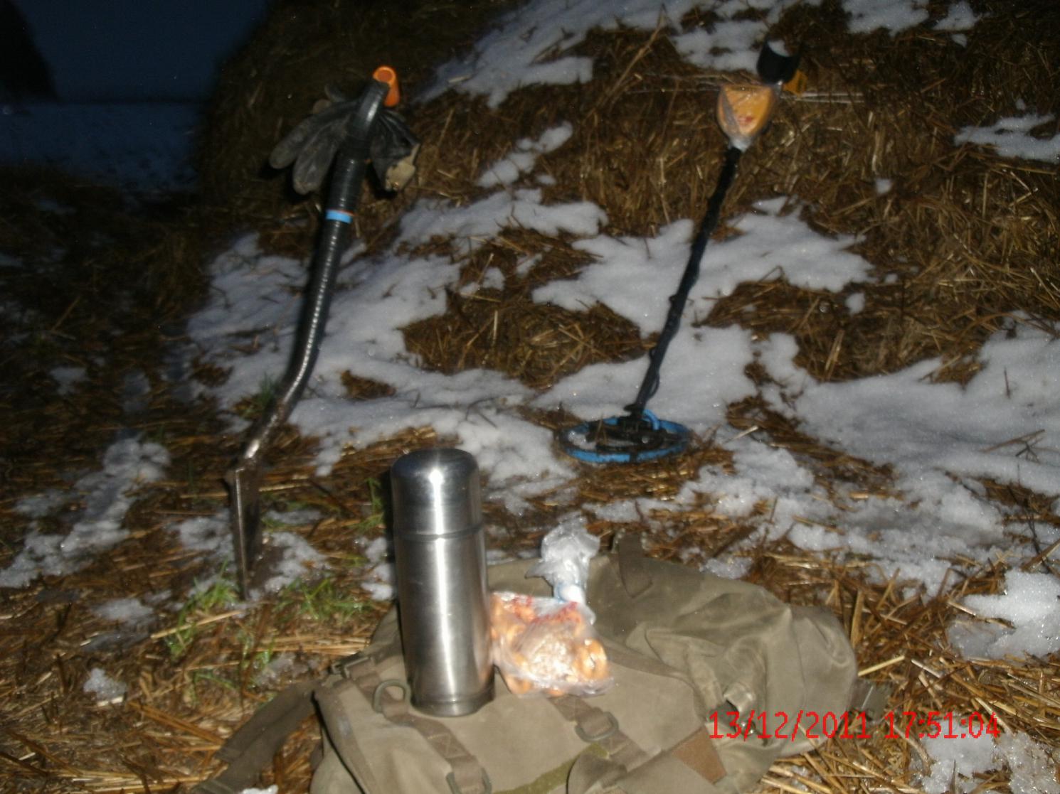 Ехали довольно медленно,температура за бортом -2,вот только сильный снегопад немного портил эту идиллию.Пока добирались до места, из головы почему-то не выходили зима 1941 и немецкое наступление под Москвой:DПримерно через два часа пути,мы бросили машину у дороги,а сами углубились в лесной массив.Еще час блуждания по лесу и мы наместе .Дальше был поиск с шурфлением и обязательным закапыванием и маскировкой шурфов, от возможных конкурентов.
