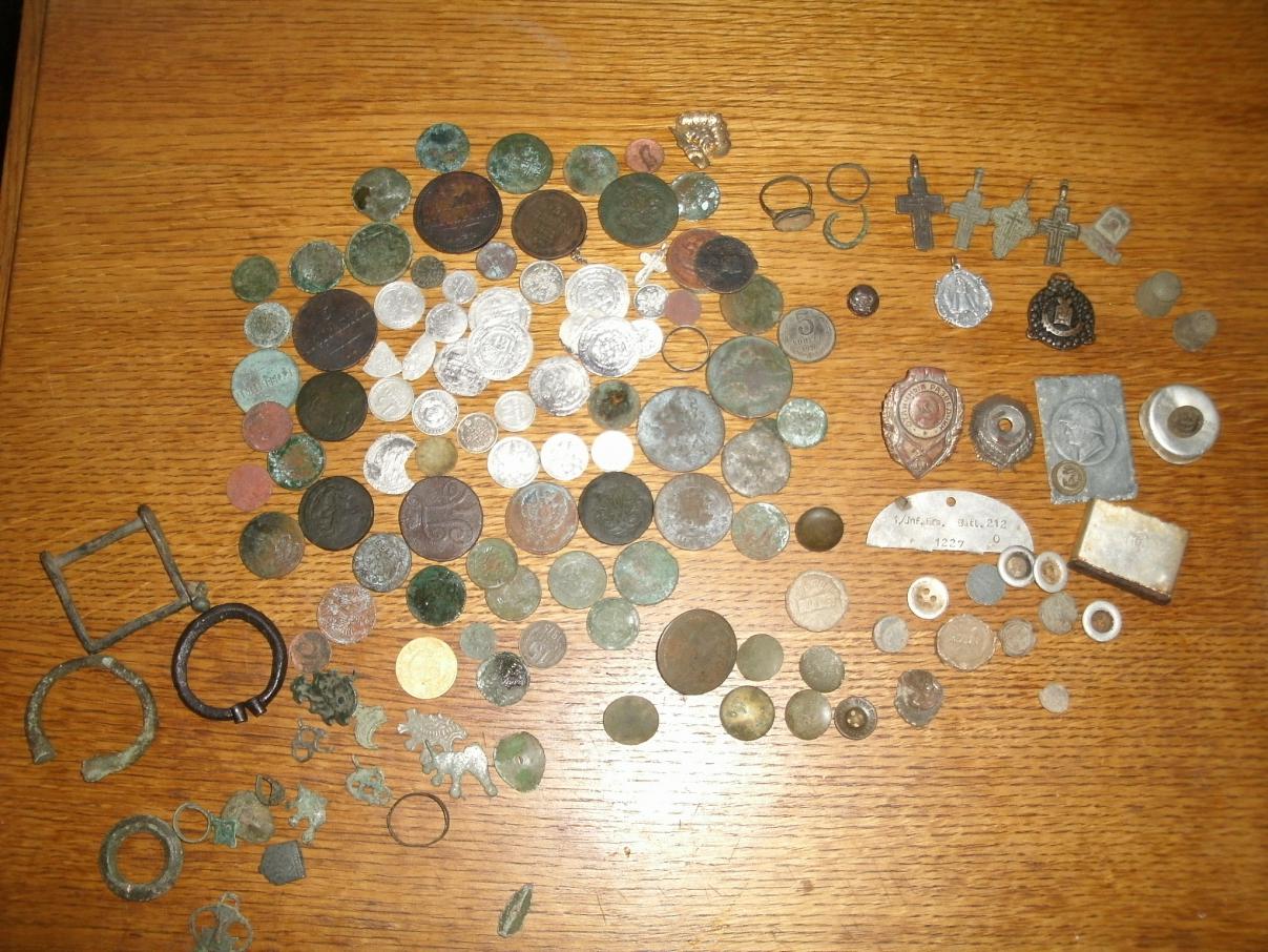 Особо крутых находок, в тот день небыло.Из интересных попались: пара имперских монет,самодельное серебряное колечко,убитый советский компас,советская мелочь,накладка губной гармошки,железный дубовый листик,часть украшения,старинная бутылочка(раньше уже попадалась такая же,может кто подскажет от чего?)и много другого хлама.Надеюсь в следующий раз, это место нас порадует необычной находкой ведь мы там первые;)