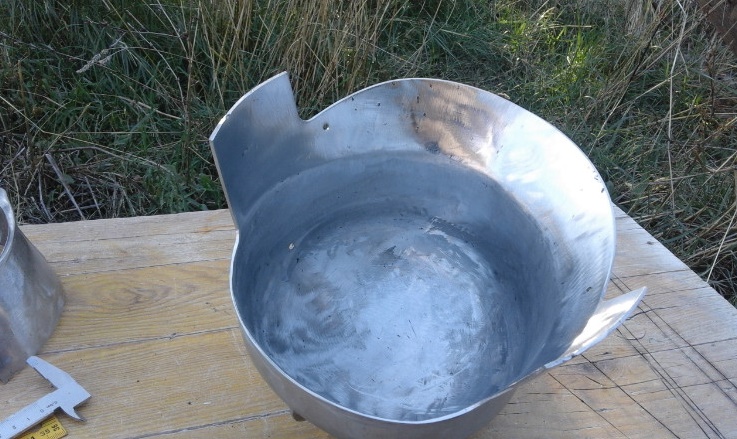 Просчитал линии реза. Внутреннее углы отводил монеткой. Отрезал лишний металл. Внешние края шлема ровнять буду на собранном шлеме.
