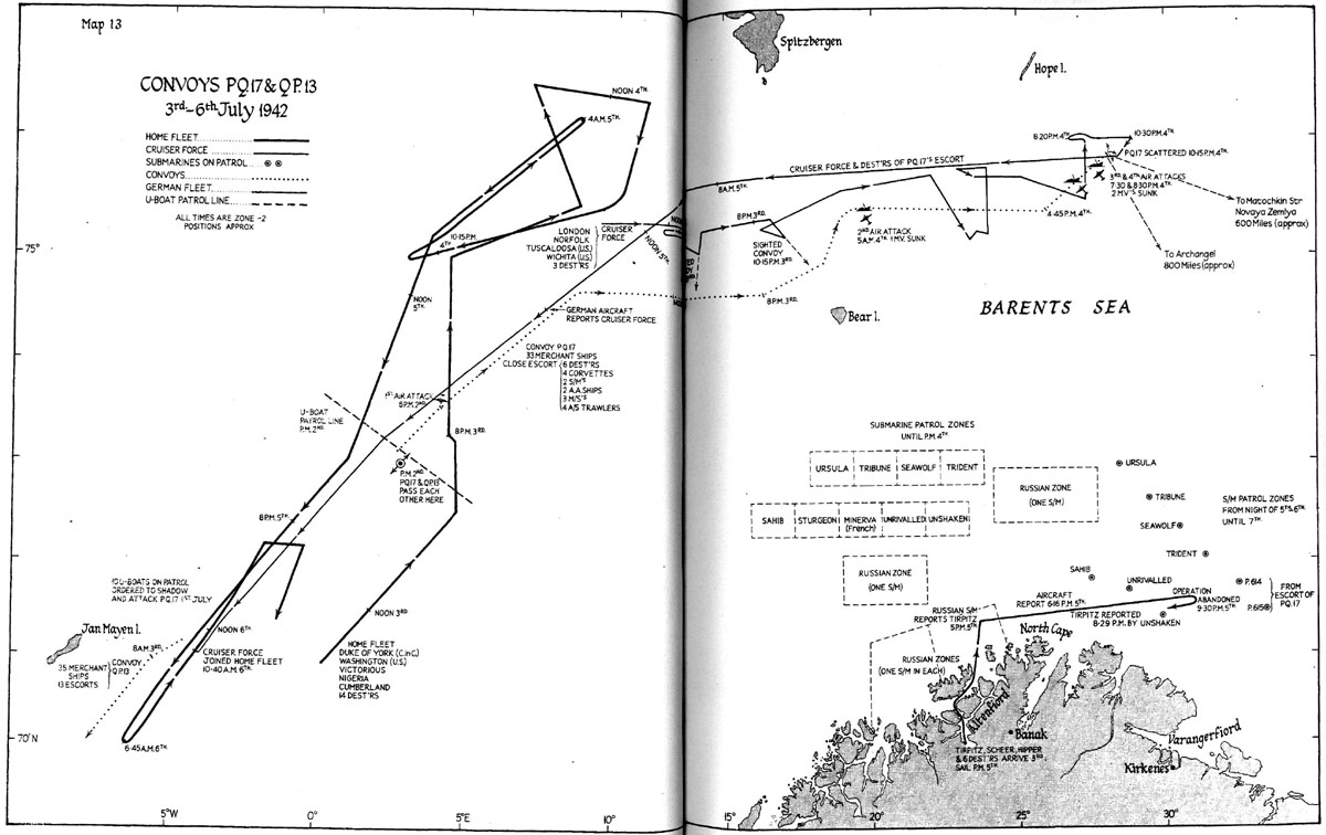С моей точки зрения, сваливать всю вину на Адмиралтейство не совсем корректно. В "Новогоднем бою" Шербрук и Барнетт доказали, что все зависит от решительности командиров эскорта и ближнего прикрытия. Тем более, что два легких крейсера и горстка эсминцев ПЛО/ПВО против реальной немецкой эскадры - ситуация гораздо худшая, чем у эскорта и крейсерского прикрытия PQ-17 против "виртуального" врага. По моему мнению: вина Гамильтона и Брума гораздо "весомее", чем Паунда.