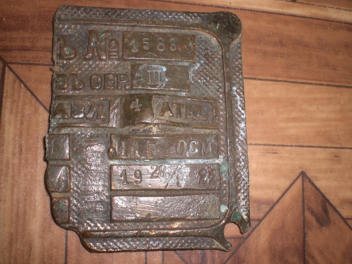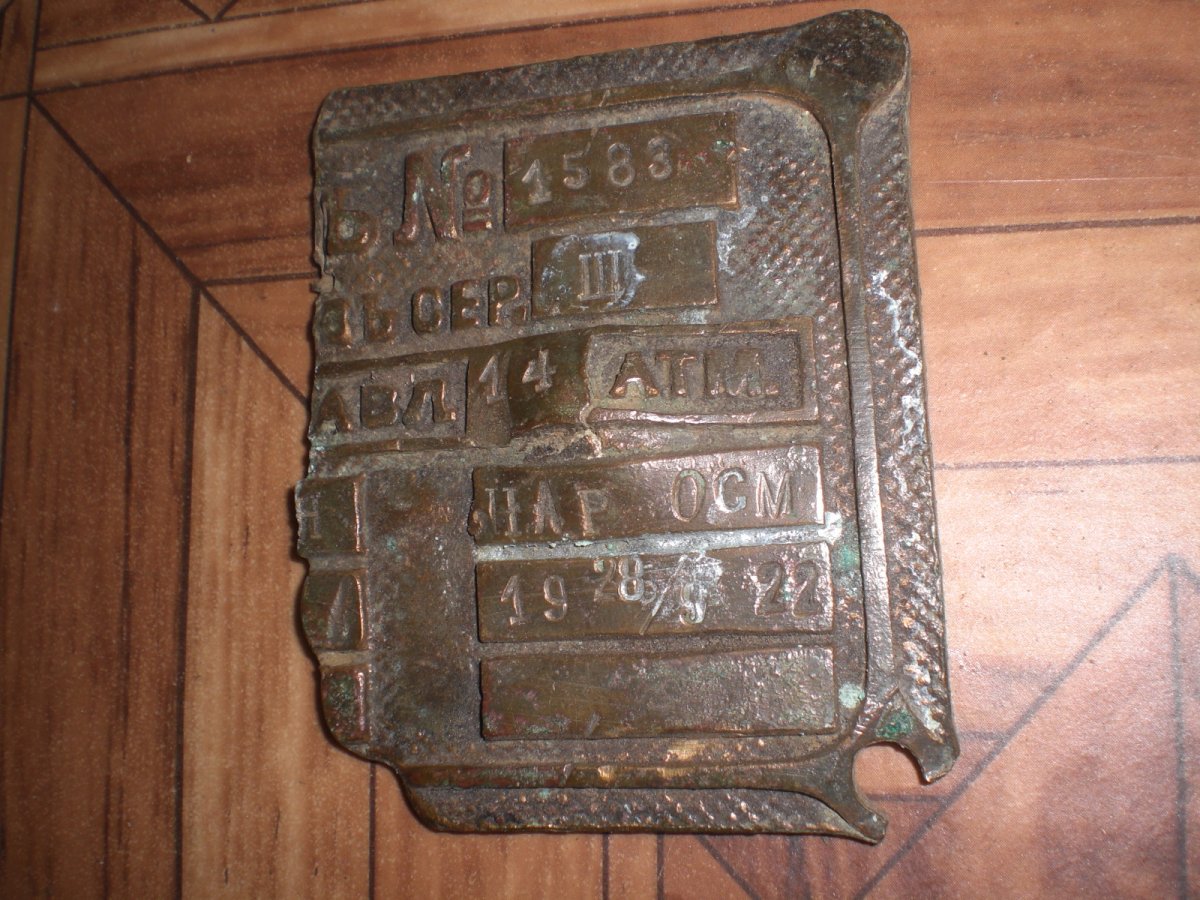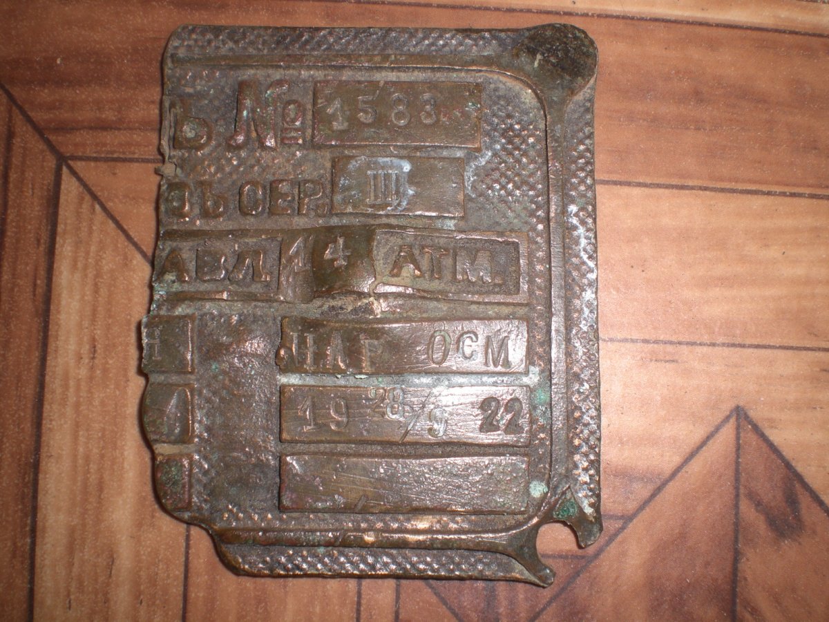 Доброго! Думаю, что это обломок таблички от котла паровоза https://streetmarket.ru/item/63034572_Паровозная_табличка_1915_год_РИ_Бронза_От_котла_Не_частая