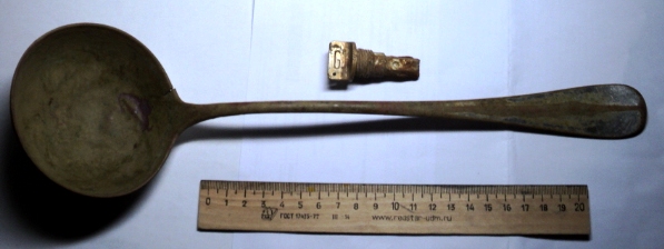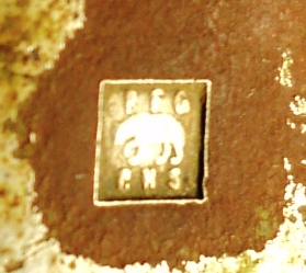 Сегодня ничего толкового не нарыл. Какая-то алюминиевая закрутка с буквой G и половник. На квадратном клейме зверь, похожий на медведя. Вверху буквы P F G, внизу C N S. Что бы это значило?