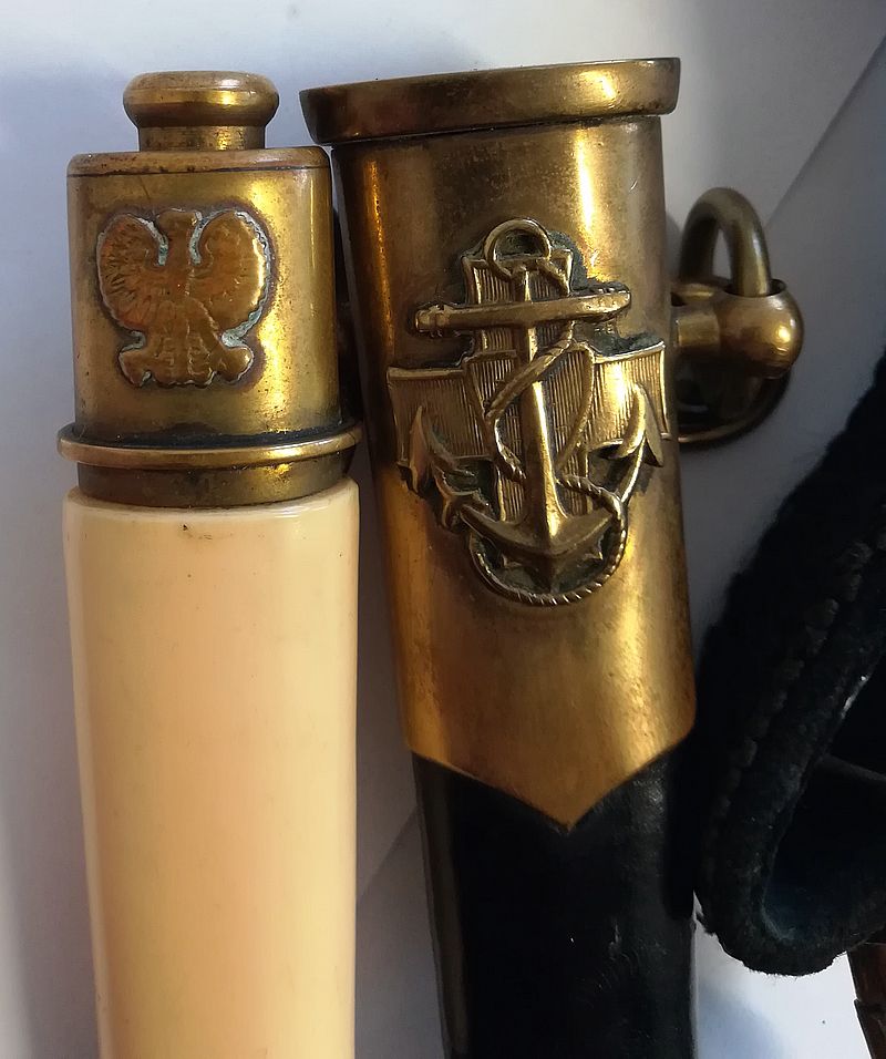 Доброго! Могу, конечно, ошибаться, но видится кортик ВМФ ПНР обр.1954 г. (Kordzik Marynarki Wojennej PRL wz.54) с замененным орлом на навершии. Кто его заколхозил так и когда, сложно сказать. Для примера, обр. 1954: Цена на ПНРовские на разных польских площадках от 400 до 800 злотых плюс-минус, в зависимости от состояния. Есть ли смысл платить за замененного орлика, решать Вам, но это не II RP. С уважением,