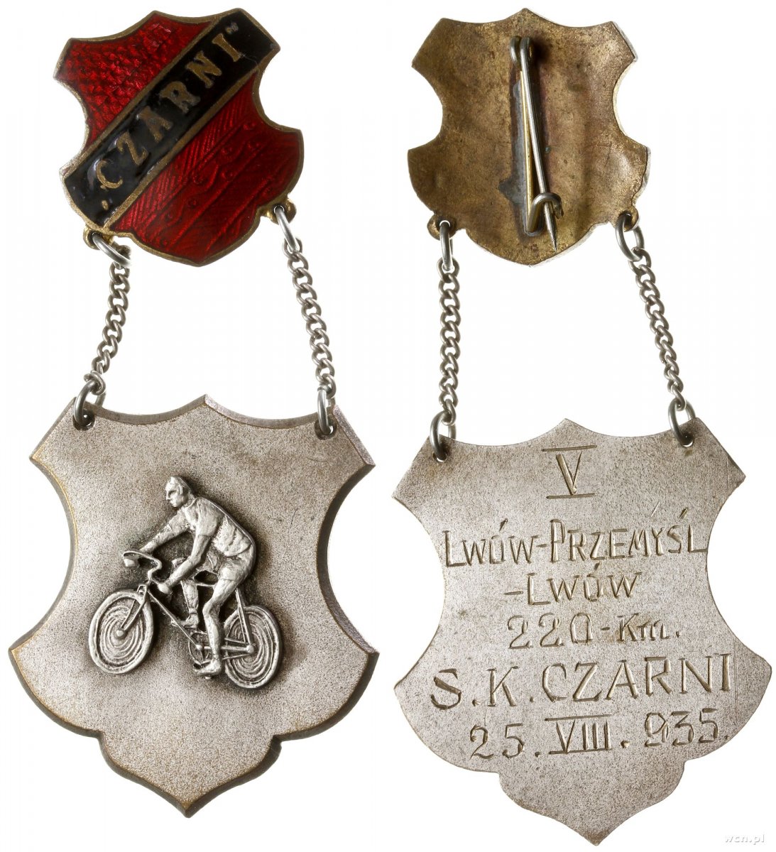 Доброго! Імхо, призовий жетон Стрілецького союза (https://www.zwiazek-strzelecki.pl/historia/) за велосипедні змагання (припущу, що 20-ті - початок 30 років, міжвоєнна Польща). Напис в нижній частині - Zw. (Związek) strzelecki. На реверсі бачаться рештки напису. Можливо було вушко (або два) подивіться верхню частину. Ось приклади подібних: З повагою,