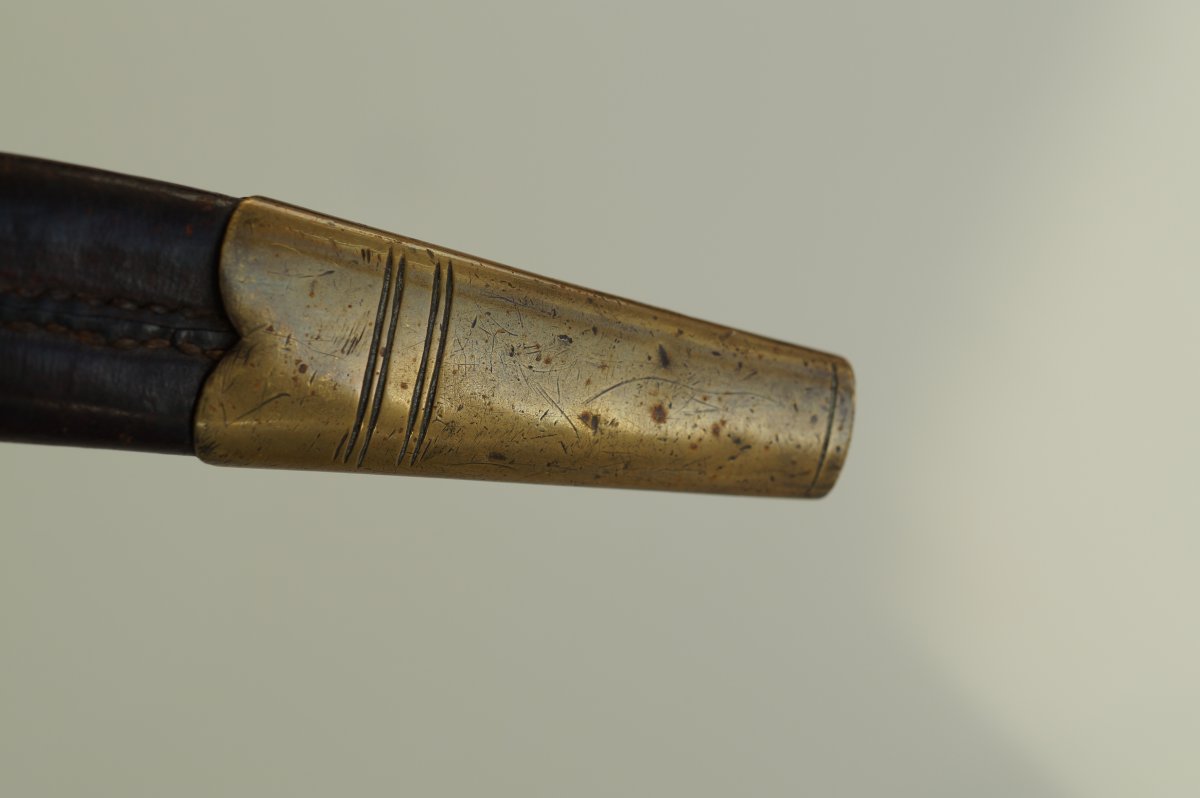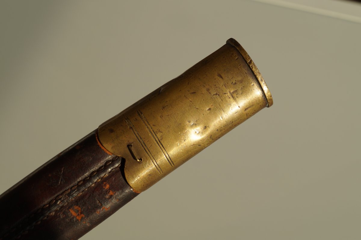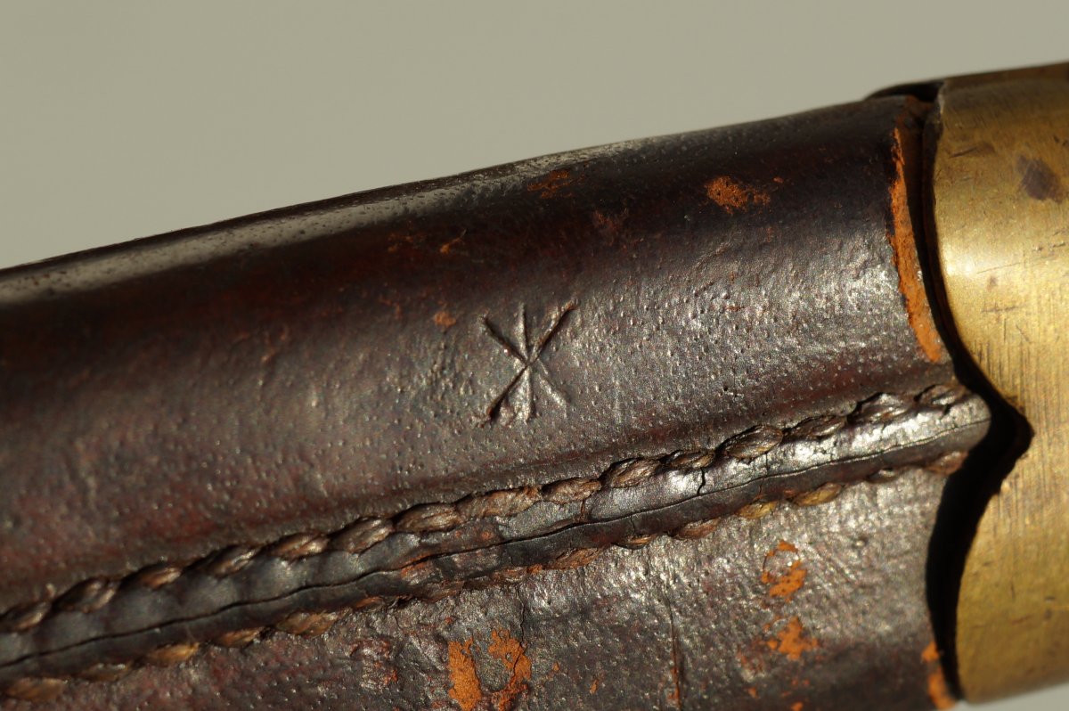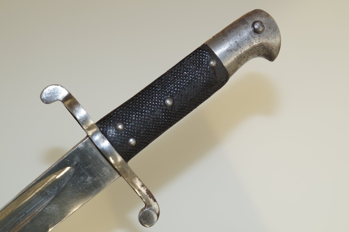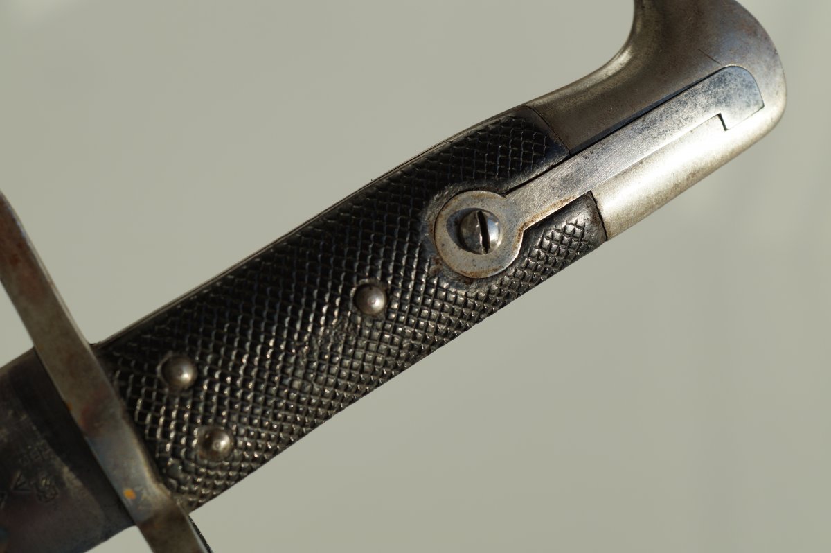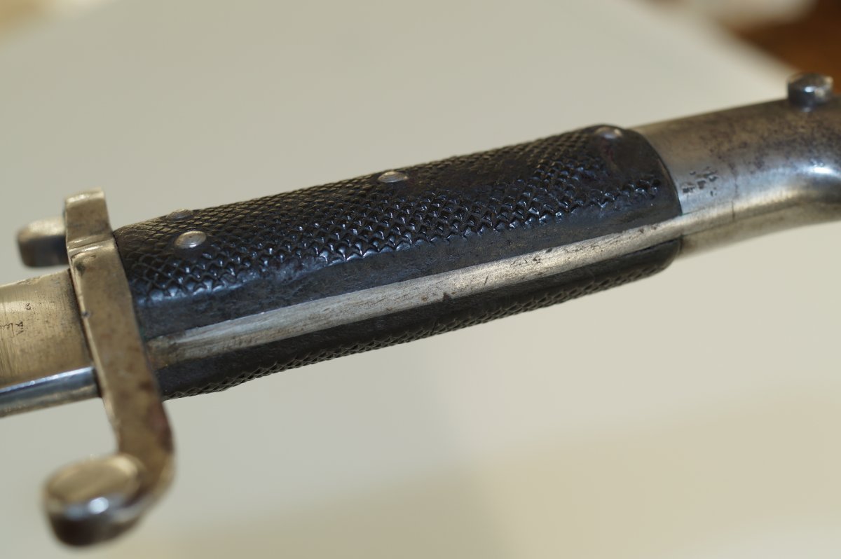 Уважаемые коллеги, помогите пожалуйста иденцифицировать данный штык. Тело ножен из тостой упругой кожи, накладки рукояти тоже из толстой кожи. Заранее огромное спасибо. С ув......