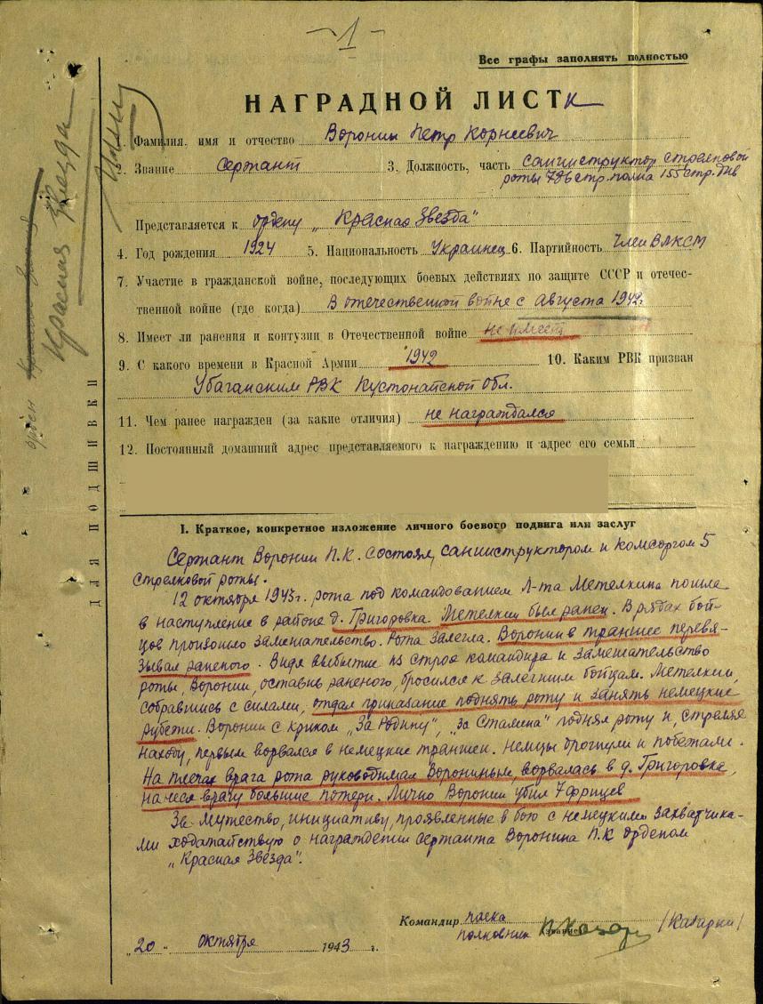 Его данные: Воронин Петр Корнеевич 1924 г.р. сержант 5 роты, 2 батальона, 786 стрелкового полка, 155 стрелковой дивизии, 27 армия, 1й Украинский фронт.