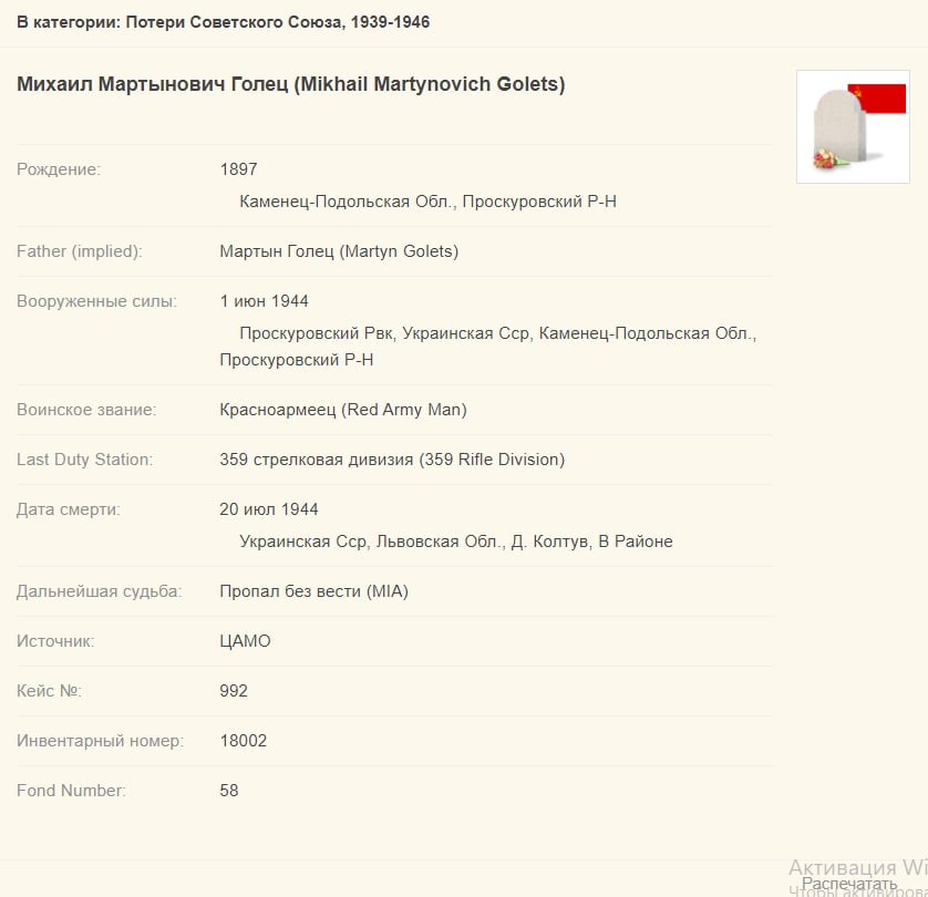 С похоронки вся родня думала что погиб где то в России под Санкт-Петербургом Я нашла лично документы в которых указуют что погиб(пропал без вести) в Львовской области с.Колтув Прочитала историю дивизии все сходится Голец Михаил Мартынович 1987 г.р Призван 1.06.1944 Входил в состав 359 стрелковой дивизии может где то есть братская могила,очень надеюсь найти хотя бы какие то данные