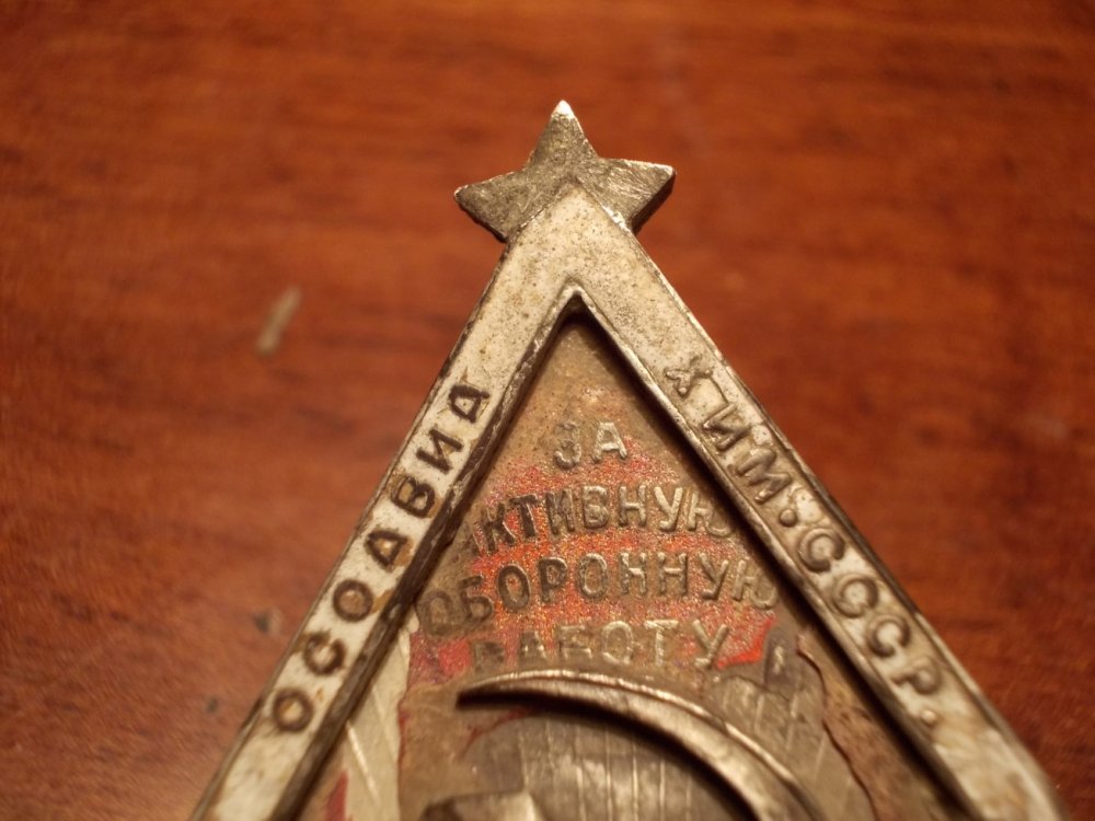 Здравствуйте, комрады. Вот знак 1932 г.в. 3й тип. Как я понял - это высшая награда ОСОАВИАХИМа. Довольно редкий. Был найден на местах боев. Эмаль в ужасном состоянии, осыпается. Сколько такой может стоить? Стоит ли реставрировать или оставить как есть?