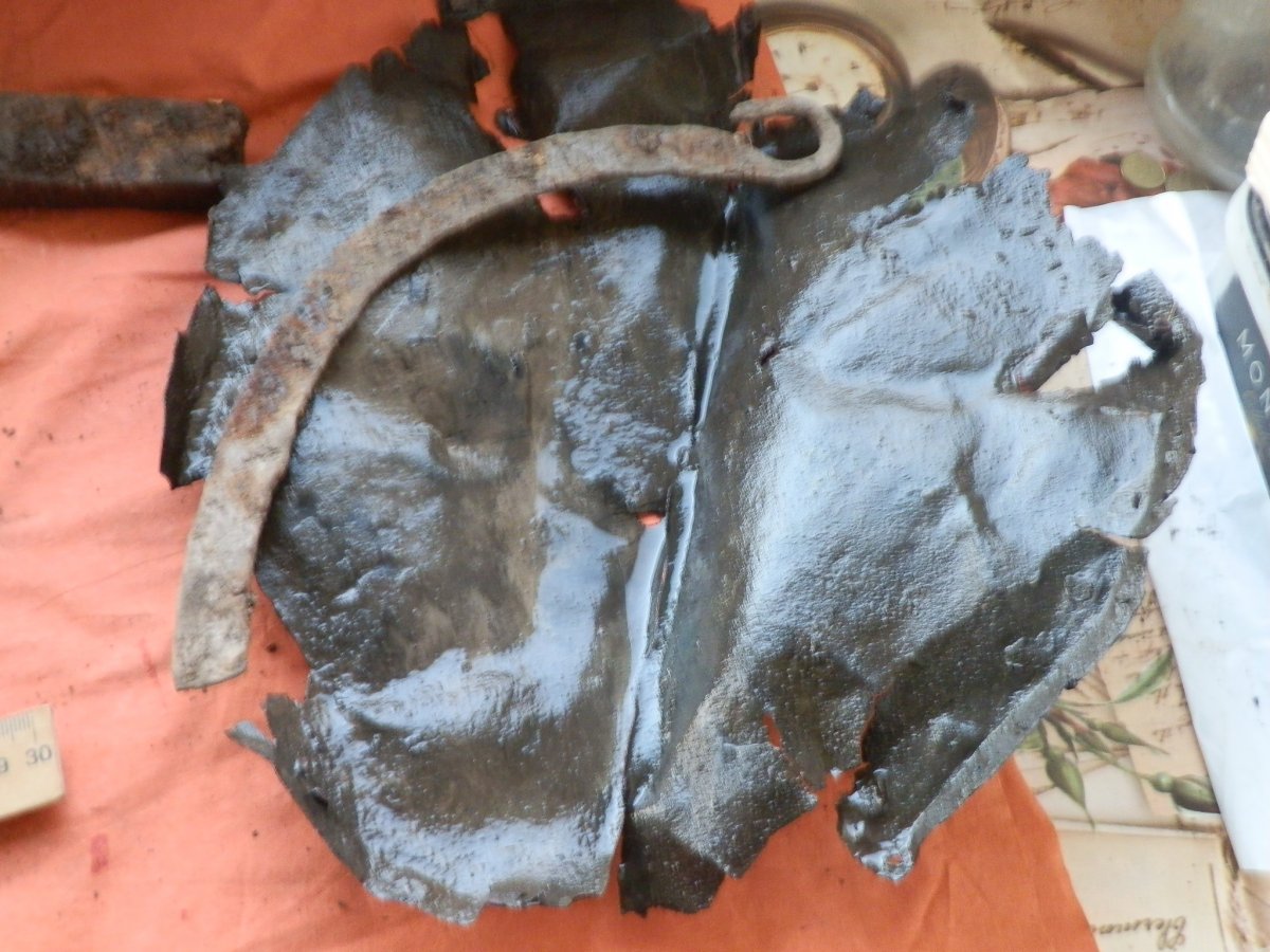 Добрый вечер ,подскажите по предметам : рало сделано с двух частей , третья фотография -походу крышка казанка так как видны заклёпки ? И пол ручки казанка , серп или коса незнаю? Все лежоло вместе .