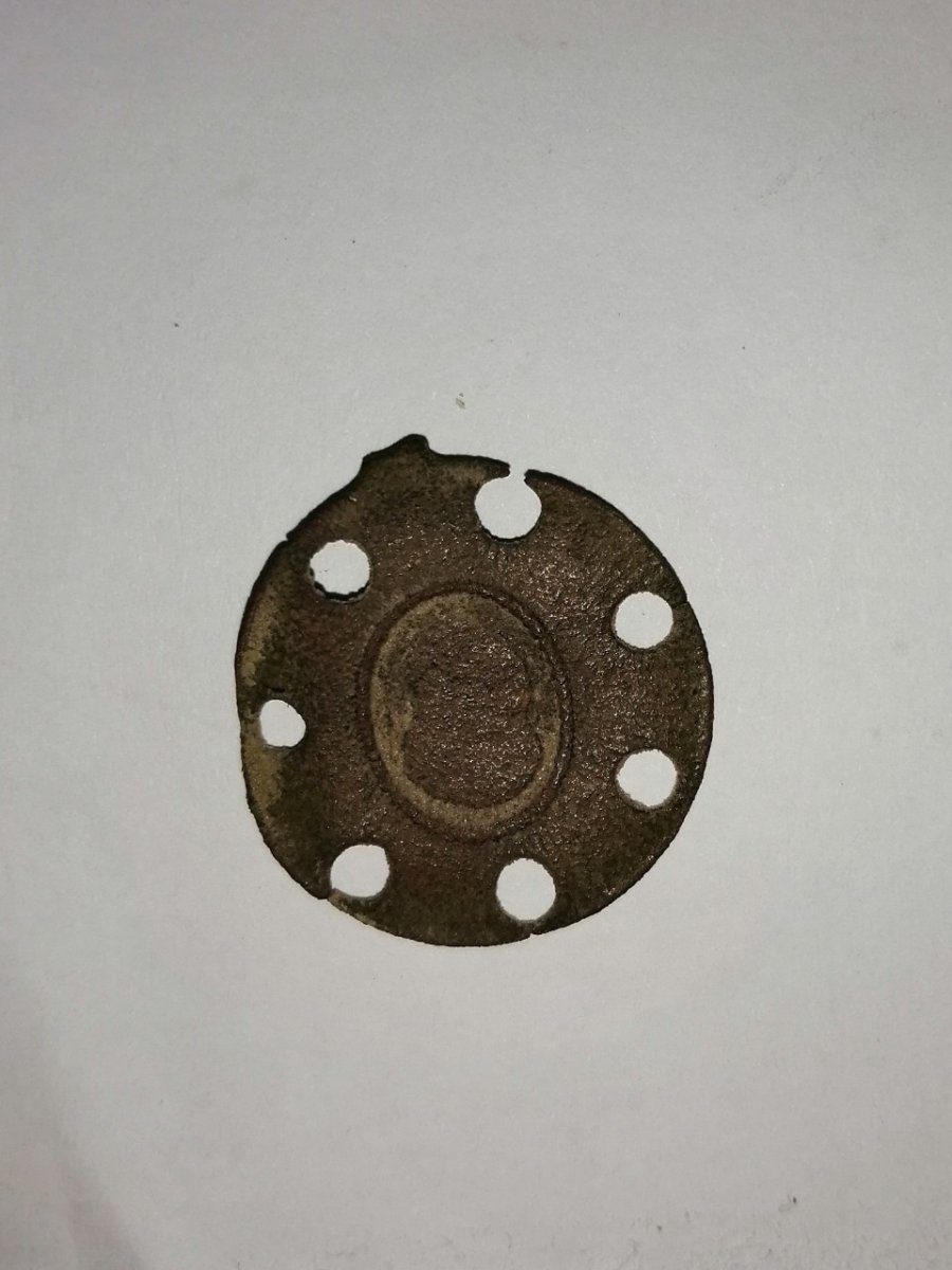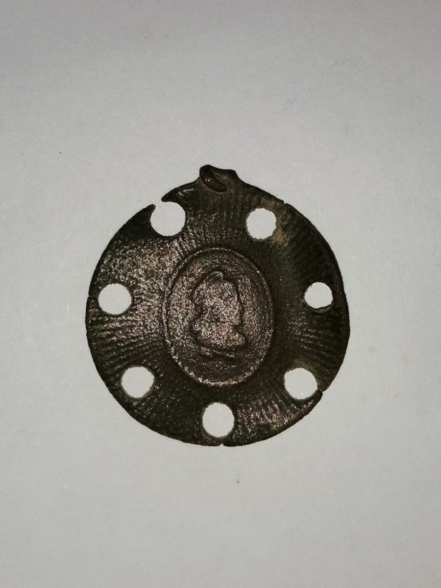 Лично мне видится католический медальон 17-18 века. На 2-м фото просматривается голова с нимбом скорее всего католического святого типа вот такого изображения: Насчет 7-ми отверстий ничего определенного сказать не могу кроме того, что для меня они ассоциируются с 7-ю днями сотворения мира. Честь имею!