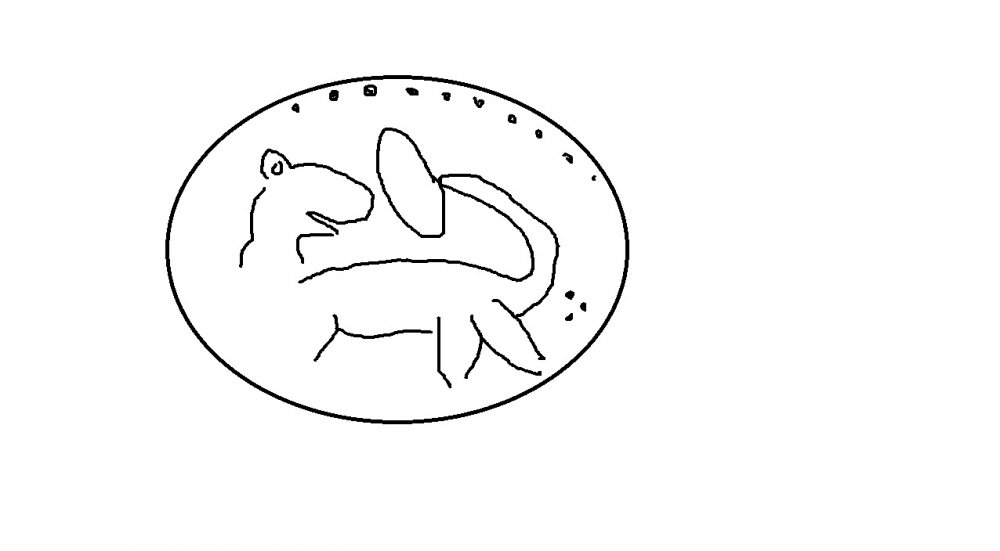 Фотографировать не стал, так как нету фотика с хорошим фокусом, вот вообщем нарисовал, на одной стороне нарисована рамочка что внутри не понятно, с другой стороны толи лев, голова повернута к хвосту и как я вижу между хвостом и мордой какая то штука)) монета медная