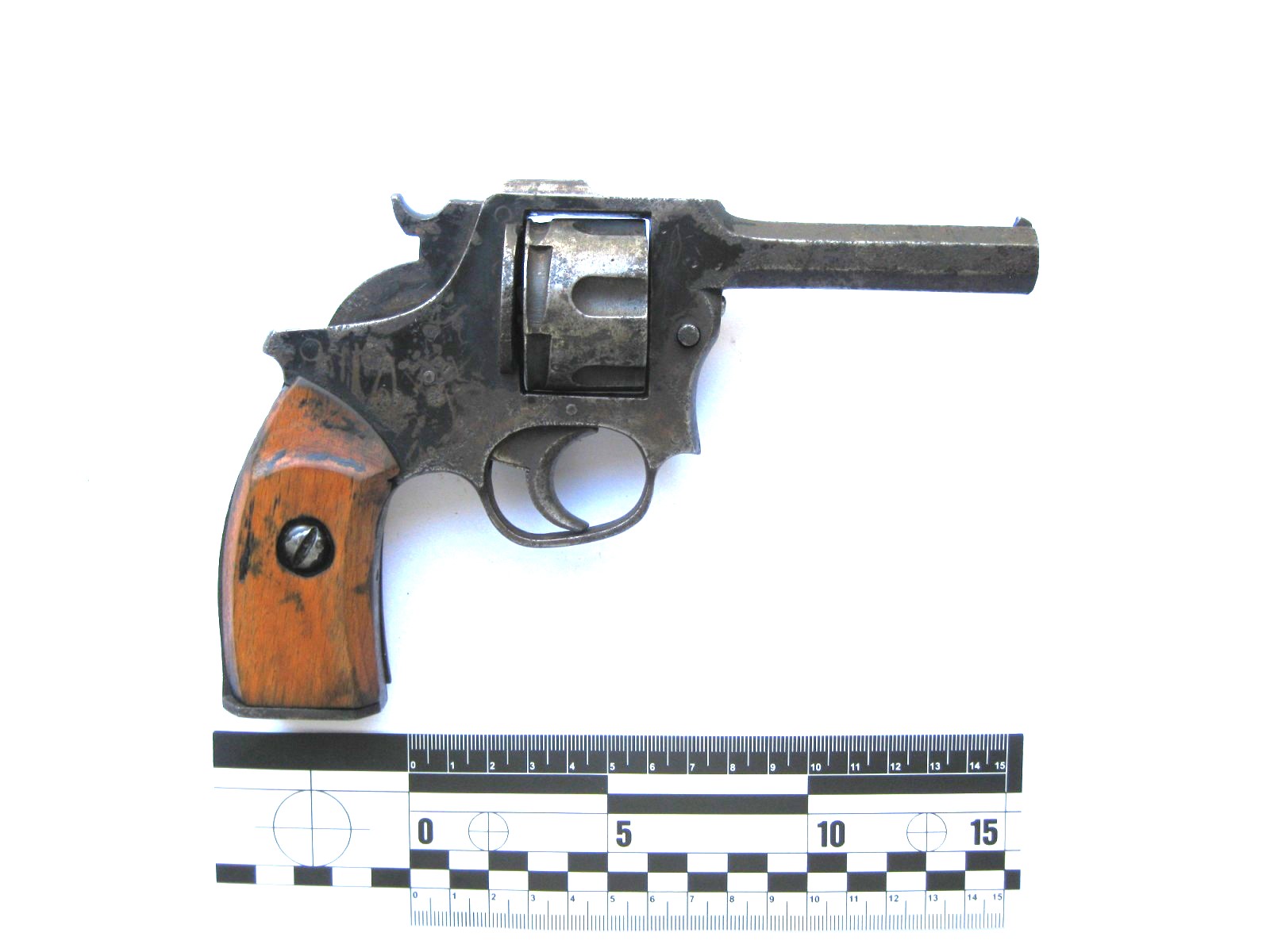 Імхо, це не самопал. Можливо, клон Веблея IRC (Irish Royal Constabulary), судячи із запобіжника системи Маузера., бельгійський або якийсь інший, фото для прикладу. Накладки, можливо, не рідні. Добре було б побачити ствол (нарізи) і розмір камор барабана. Судячи з масштабної лінійки, фото поліцейське:).