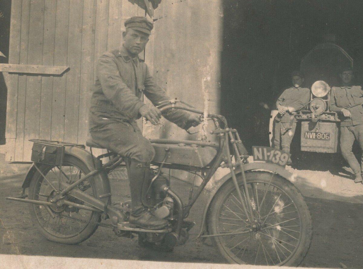 С идентификацией мотоцикла как раз проблем нет.Там очень хорошо видна надпись на бензобаке.По униформе - близко Дания.На рисунке в центре капрал-гусар.